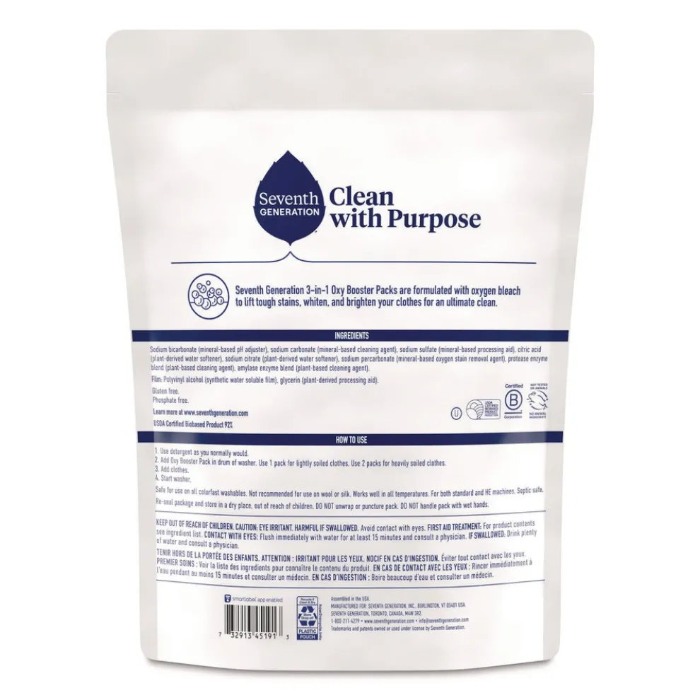 Just toss one pack in with each load with Seventh Generation laundry soap, then let its incredible 3-in-1 formula do the rest. Your family deserves a laundry booster that’s effective. Our Oxy Booster Packs whiten whites and keep colors protected. You’ll wonder how your laundry ever lived without them. Use with our laundry detergent, fabric softener sheets or liquid, and our stain remover spray. At Seventh Generation, we do business differently. We believe our products are healthy solutions for use within your home and for the community. We are always evaluating how to increase performance and safety, and create a more sustainable supply chain. Furthermore, we believe it is our responsibility to set a course for a more mindful way of doing business, where companies act as partners with other stakeholders to create a brighter future for the whole planet. Seventh Generation is proud to be a Certified B Corporation. B Corps are certified to be better for workers, and better for communities. By choosing Seventh Generation Laundry Detergent and Stain Remover for clothes products, you’re joining us in nurturing the health of the next seven generations.
