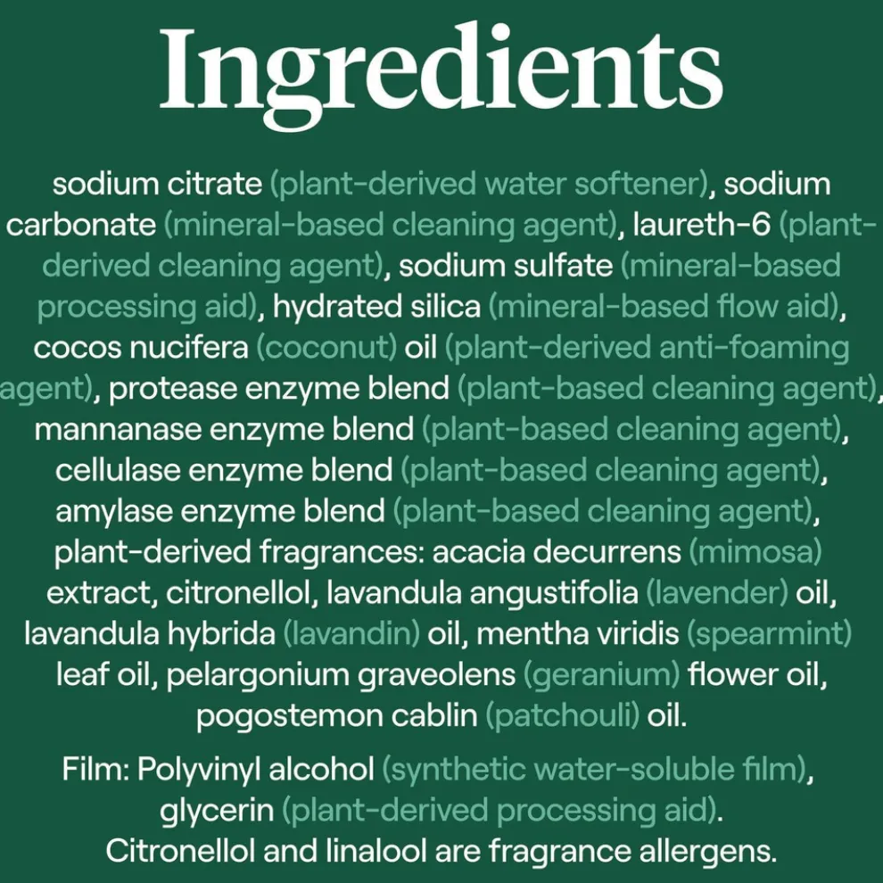 A truly safe and effective laundry pack option. Convenient single dose packs with no measuring, no guesswork, no waste. Non-toxic, four-enzyme formula fights tough stains and fully dissolves in all temperatures. Clinically tested hypoallergenic and non-irritating to skin. Free of dyes and artificial fragrances. Designed for standard and HE machines.