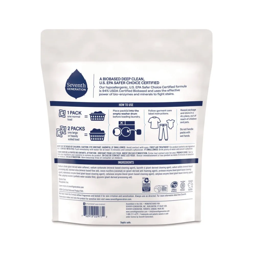 A truly safe and effective laundry pack option. Convenient single dose packs with no measuring, no guesswork, no waste. Non-toxic, four-enzyme formula fights tough stains and fully dissolves in all temperatures. Clinically tested hypoallergenic and non-irritating to skin. Free of dyes and artificial fragrances. Designed for standard and HE machines.
