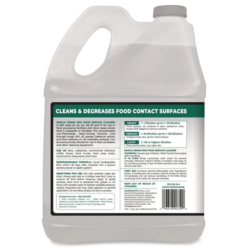 Simple Green PRO Food Service Cleaner is a powerful, professional-strength cleaner and degreaser that cuts through even tough baked-on foods, grease and built-up grime without harsh chemicals. NSF registered A1, A2, A4, A8, B1 and C1 for use in commercial kitchens and other areas where food is prepared or handled. PRO Food Service Cleaner is the perfect choice for restaurants, bars, cafeterias, food trucks, bakeries, coffee shops, lunchrooms and more. Works great on all washable surfaces including counters, walls, floors, appliances, cooking equipment, stoves, range hoods, utensils and laundry. The clean-rinsing formula contains no added color or scent. Cost-effective concentrate can be diluted and used manually or in cleaning equipment.