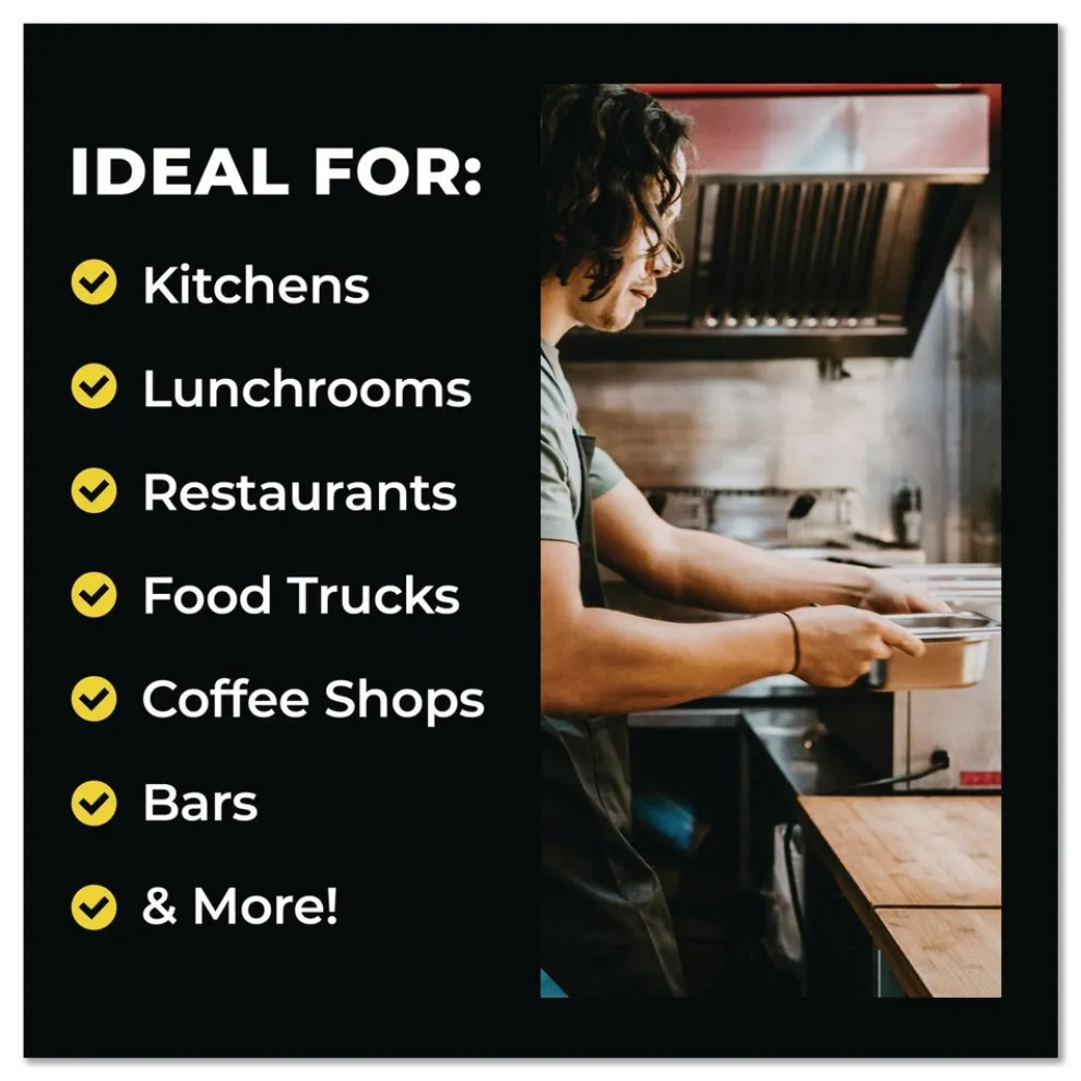 Ideal for use in food service such as restaurants, bars, cafeterias, food trucks, commercial kitchens, bakeries, coffee shops, lunchrooms and more