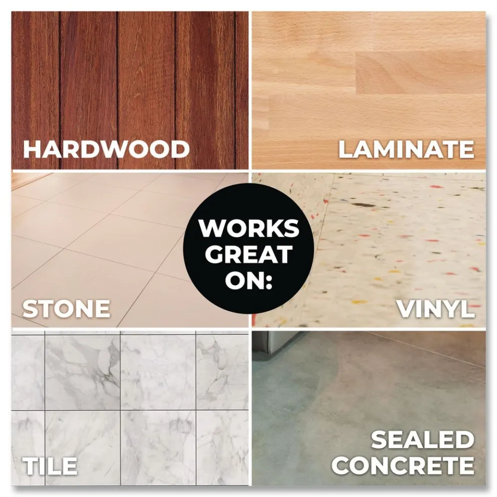 Effectively cleans all hard flooring including hardwood, laminate, LVP, tile, stone, sealed concrete, engineered wood, marble, ceramic, linoleum, vinyl and more.