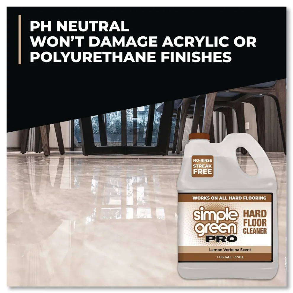 Simple Green PRO Hard Floor Cleaner effectively cleans all types of hard flooring. This professional-strength, pH neutral cleaner was designed for use on hardwood, laminate, LVP, stone, tile, vinyl, ceramic, linoleum and sealed concrete, eliminating the need for multiple specialty floor cleaners. PRO Hard Floor Cleaner lifts away dirt and grime without leaving any dulling residue behind, allowing the natural beauty of your floors to shine through. Powerful plant-derived ingredients and minerals are used in place of harsh petroleum distillates, ammonia, chlorine, phosphates or phthalates commonly found in other floor cleaners. Our ready-to-use formula is ideal for both spray and mop and bucket applications, and leaves behind a clean, streak-free shine.