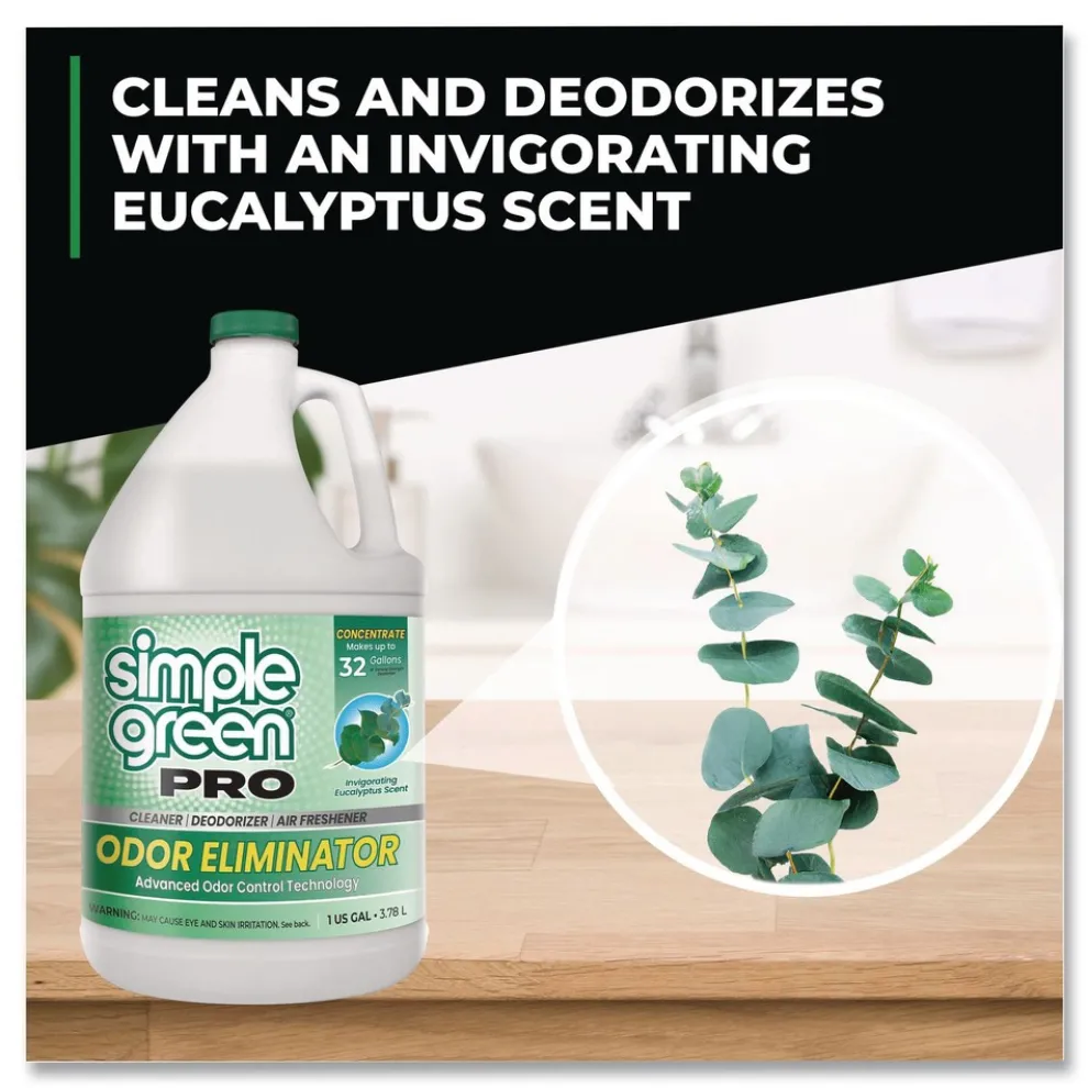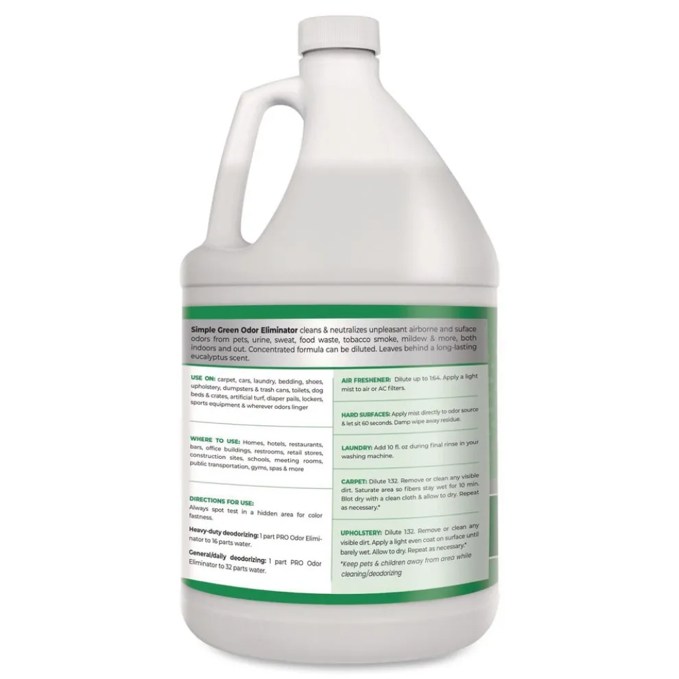 Simple Green Pro Odor Eliminator is a concentrated cleaner and long-lasting odor neutralizer that removes unpleasant airborne and surface odors caused by pets, urine, sweat, food waste, tobacco smoke, mildew and more, leaving behind an invigorating eucalyptus scent. Works great on carpet, bedding, upholstery, laundry, vehicles, dumpsters, trash cans, toilets, lockers, shoes, diaper pails, sports equipment, artificial turf, dog beds and crates-both indoors and out. Ideal for use in homes, office buildings, restrooms, restaurants, retail stores, schools, gyms, spas and wherever odors linger.