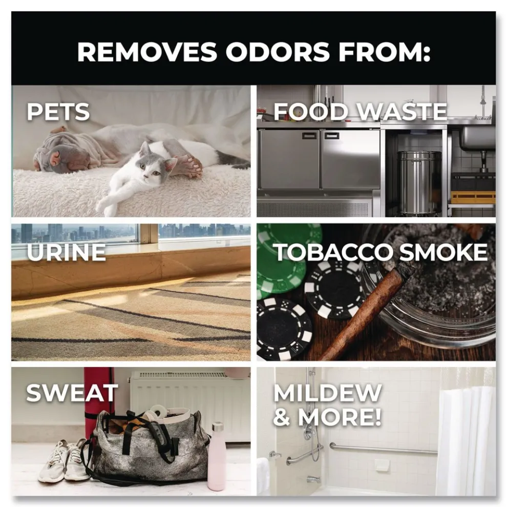 Neutralizes unpleasant odors caused by pets, urine, sweat, food waste, tobacco smoke, mildew and more