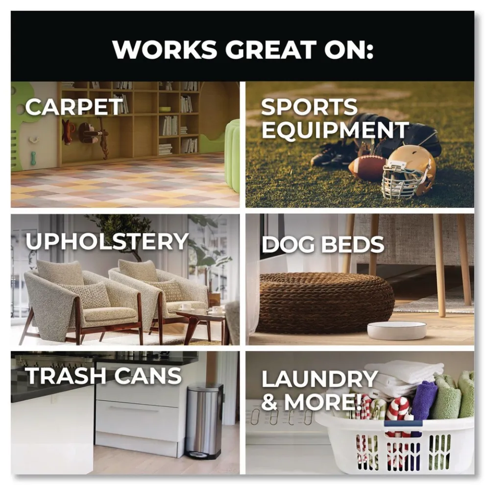 Works great on carpet, bedding, upholstery, laundry, vehicles, dumpsters, trash cans, toilets, lockers, shoes, diaper pails, sports equipment, artificial turf, dog beds, crates and more