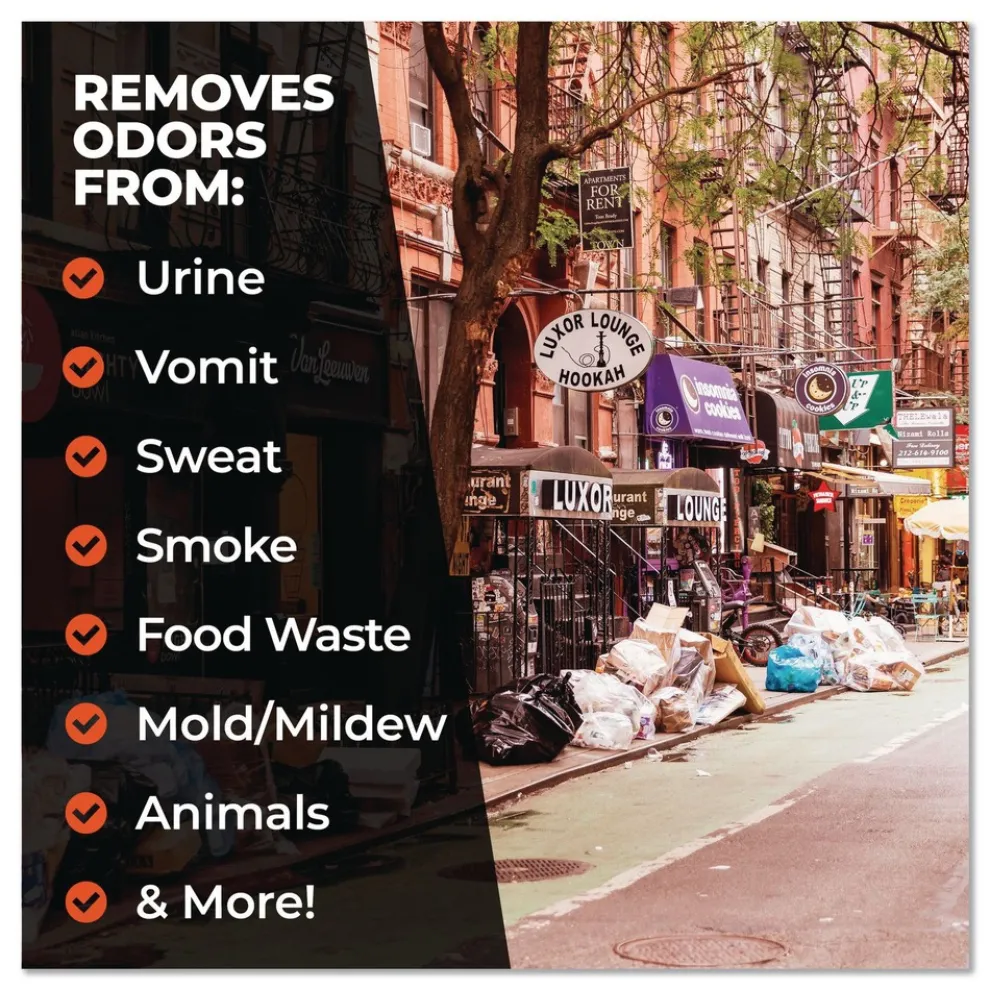 Eliminates foul smells caused by urine, vomit, sweat, animals, manure, mold, mildew, smoke, garbage, graywater, skunk, food, decayed vegetation and more