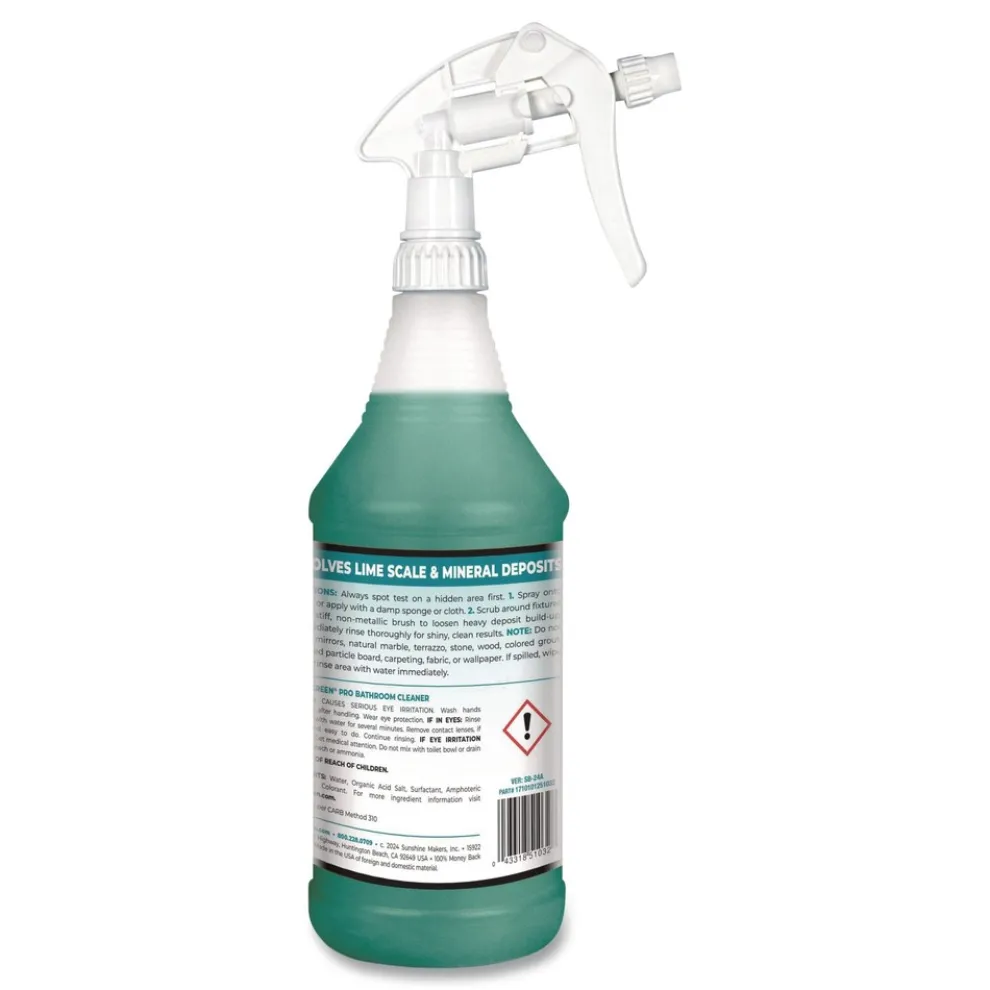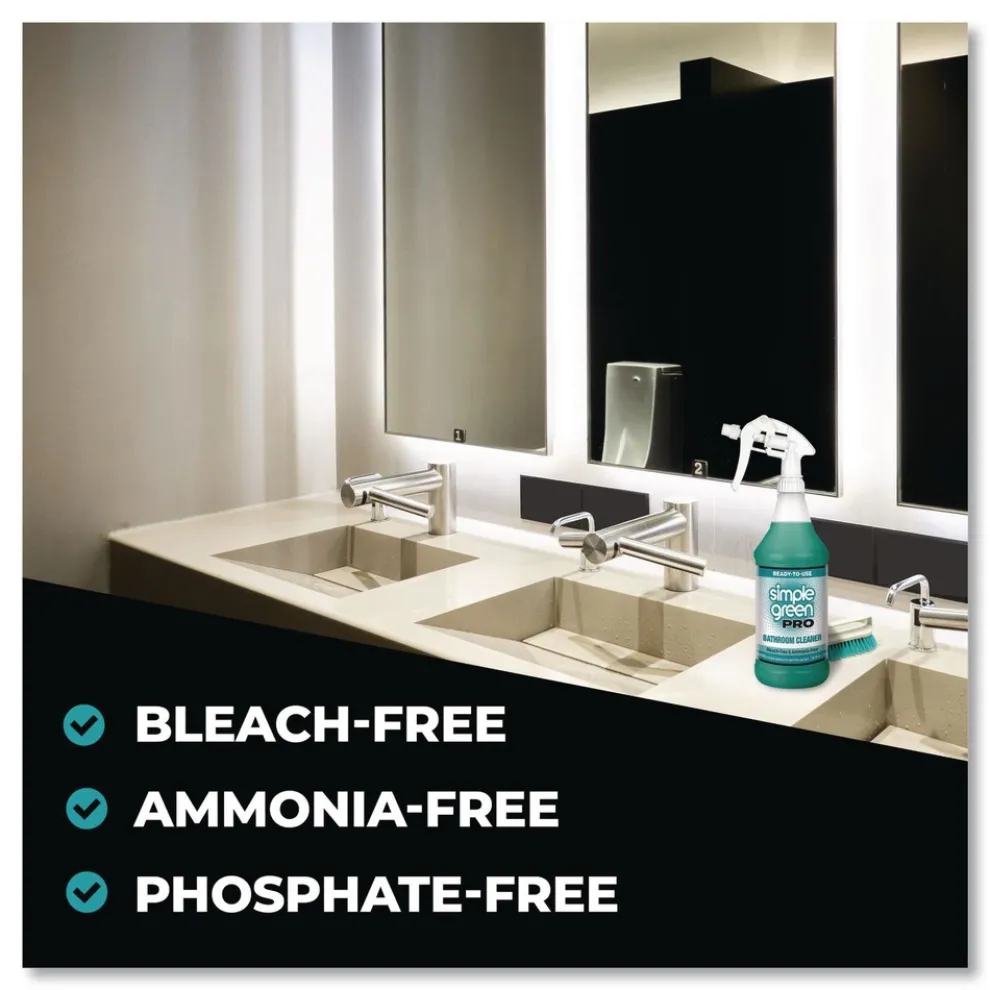 Simple Green PRO Bathroom Cleaner is specially formulated to dissolve and remove dirt, lime scale, mineral deposits, hard water stains, soap scum, light rust and oxidation without harming protective finishes. Use on ceramic, glass, porcelain, stainless steel, aluminum, chrome, copper and more. Works great on sinks, showers, toilets, tubs, faucets, fixtures and drains. Deodorizes as it cleans. Bleach and ammonia free.
