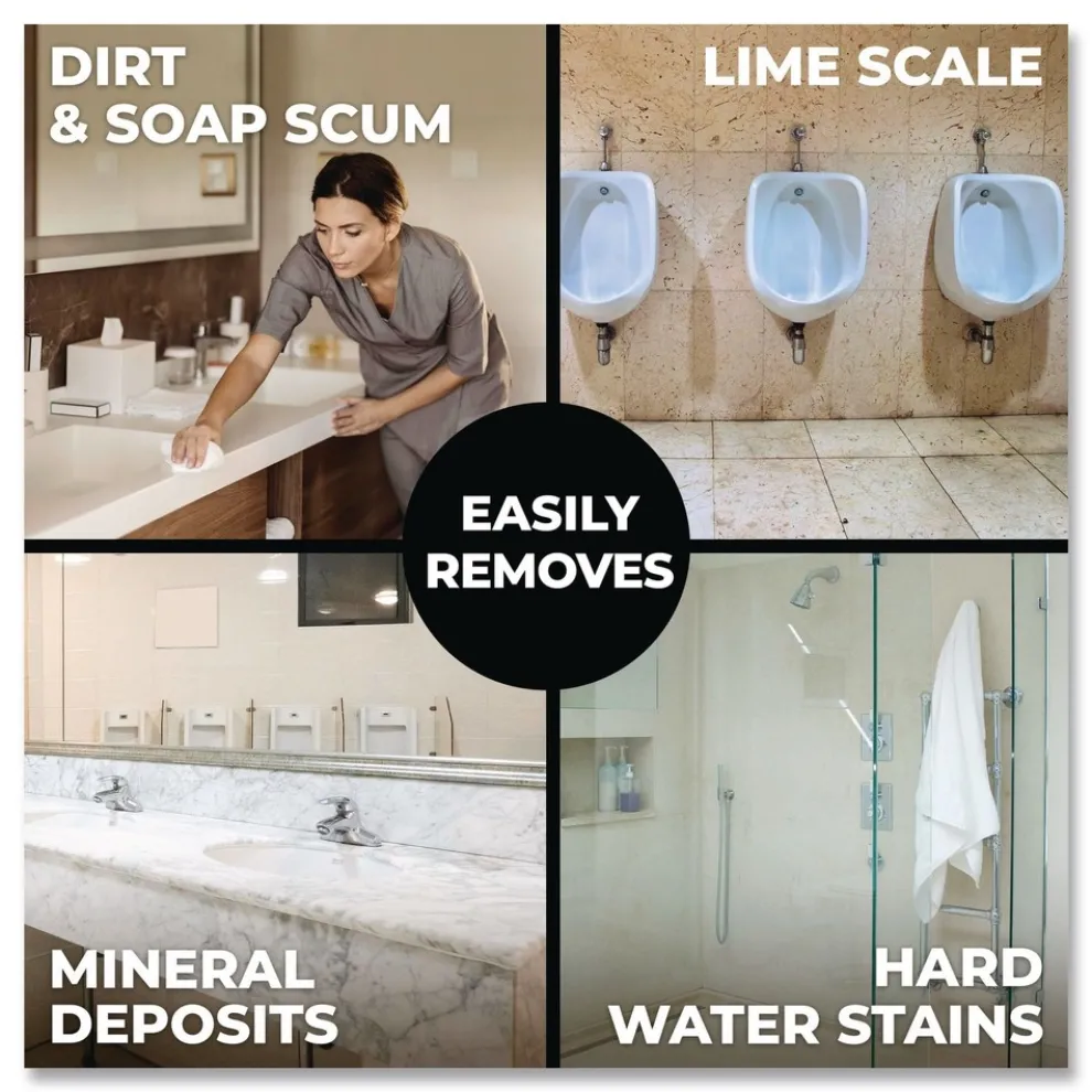 Effectively removes dirt, lime scale, mineral deposits, hard water stains, soap scum, light rust and oxidation