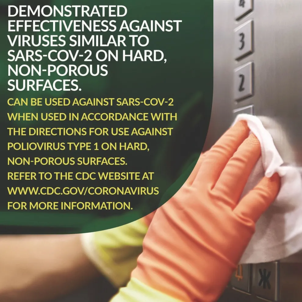 Demonstrated effectiveness against viruses similar to SARS-CoV-2 (COVID-19) on hard, non-porous surfaces; can be used against SARS-CoV-2 when used in accordance with the directions for use against Feline Picornavirus on hard non-porous surfaces