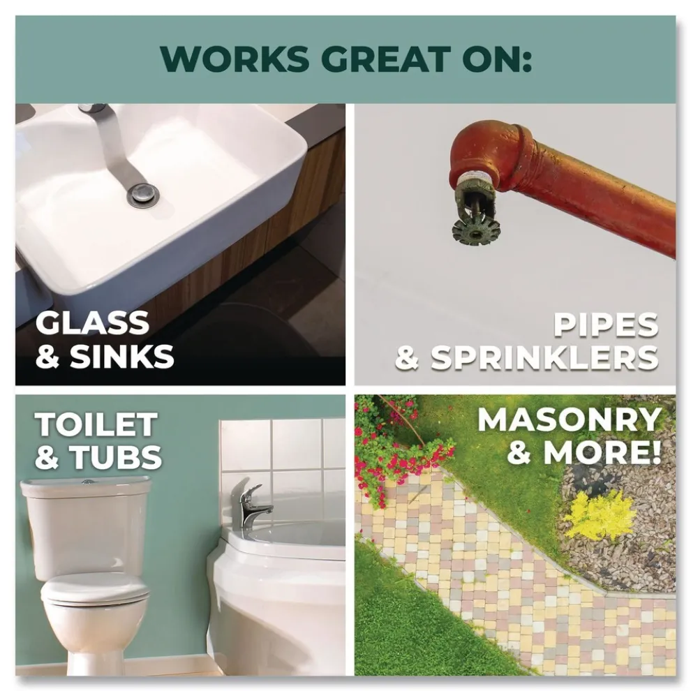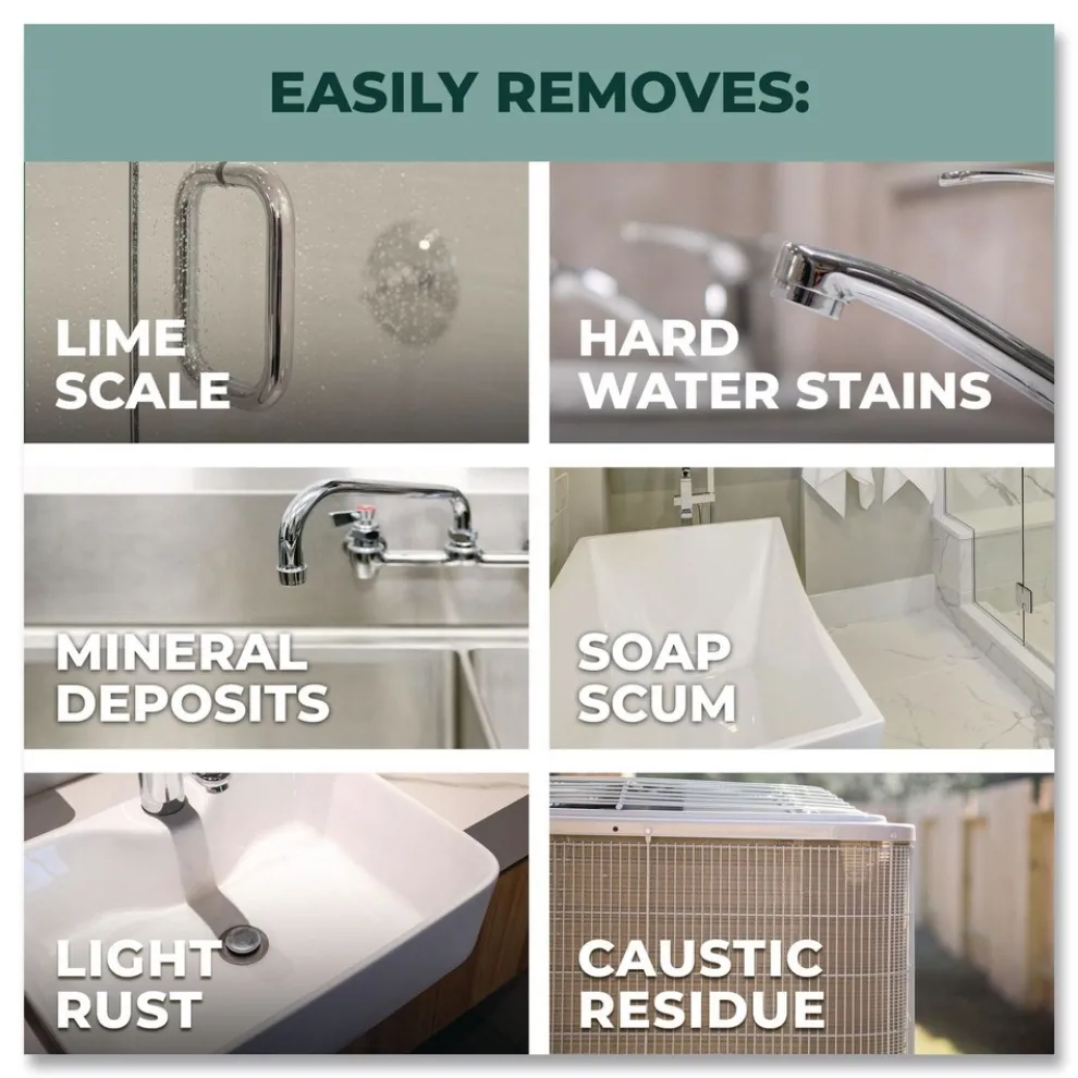 Powerful descaler removes even tough, built-up lime scale, mineral deposits, hard water stains, soap scum and oxidation with ease