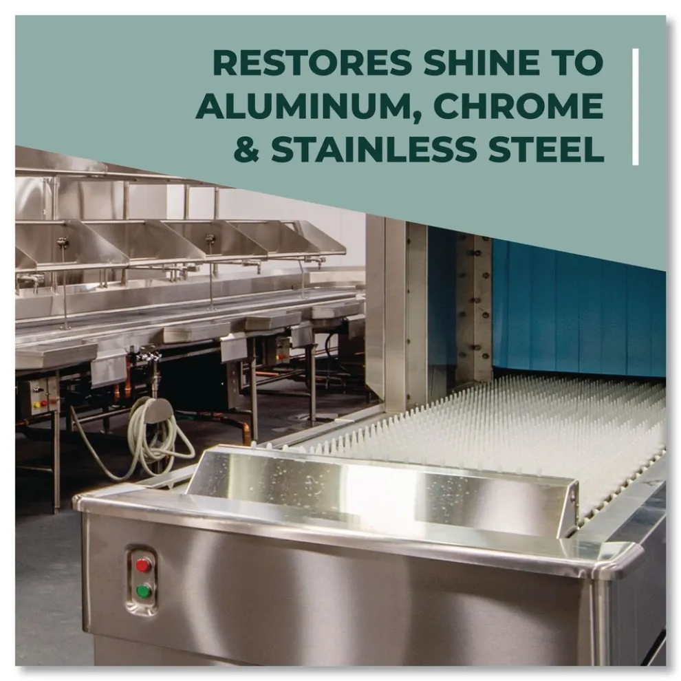Removes stains and restores clarity to stainless steel, chrome, aluminum, and other metal surfaces, fixtures and equipment, both indoors and outdoors