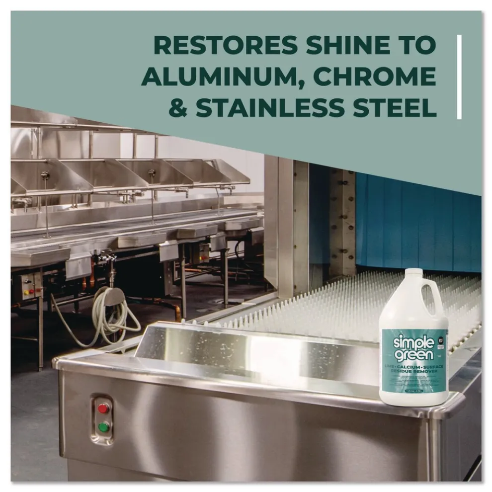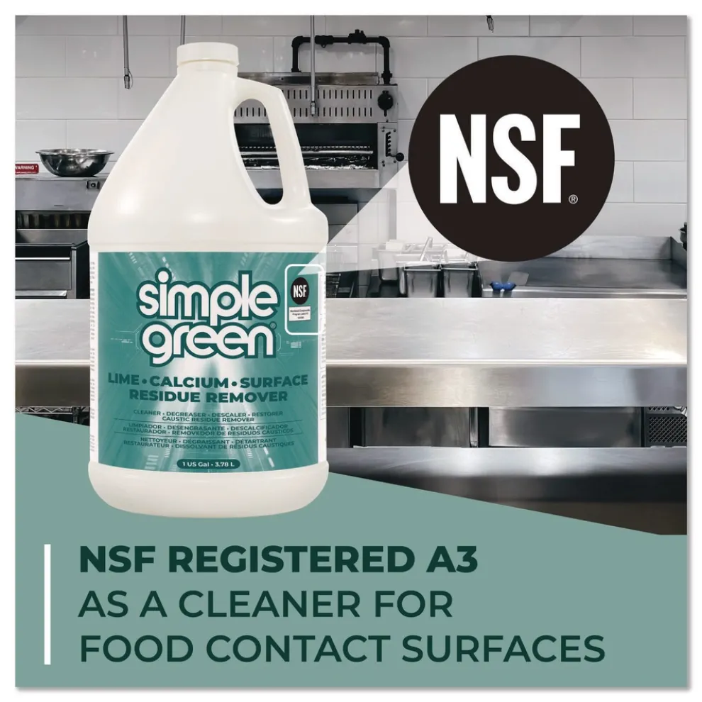Simple Green Lime Calcium Surface Residue Remover is a powerful cleaner, degreaser, descaler, restorer, efflorescence and residue remover. NSF registered A3 as a cleaner for food contact surfaces making it ideal for use around food processing facilities and equipment. Easily removes lime scale, caustic and chlorinated cleaner residues, efflorescence, soap scum, mineral and organic deposits. Removes stains and restores clarity to stainless steel, chrome, aluminum, metals and other washable surfaces. Does not contain bleach, ammonia or phosphorus. Regular use prevents mineral deposit build-up to maintain plant asepsis.