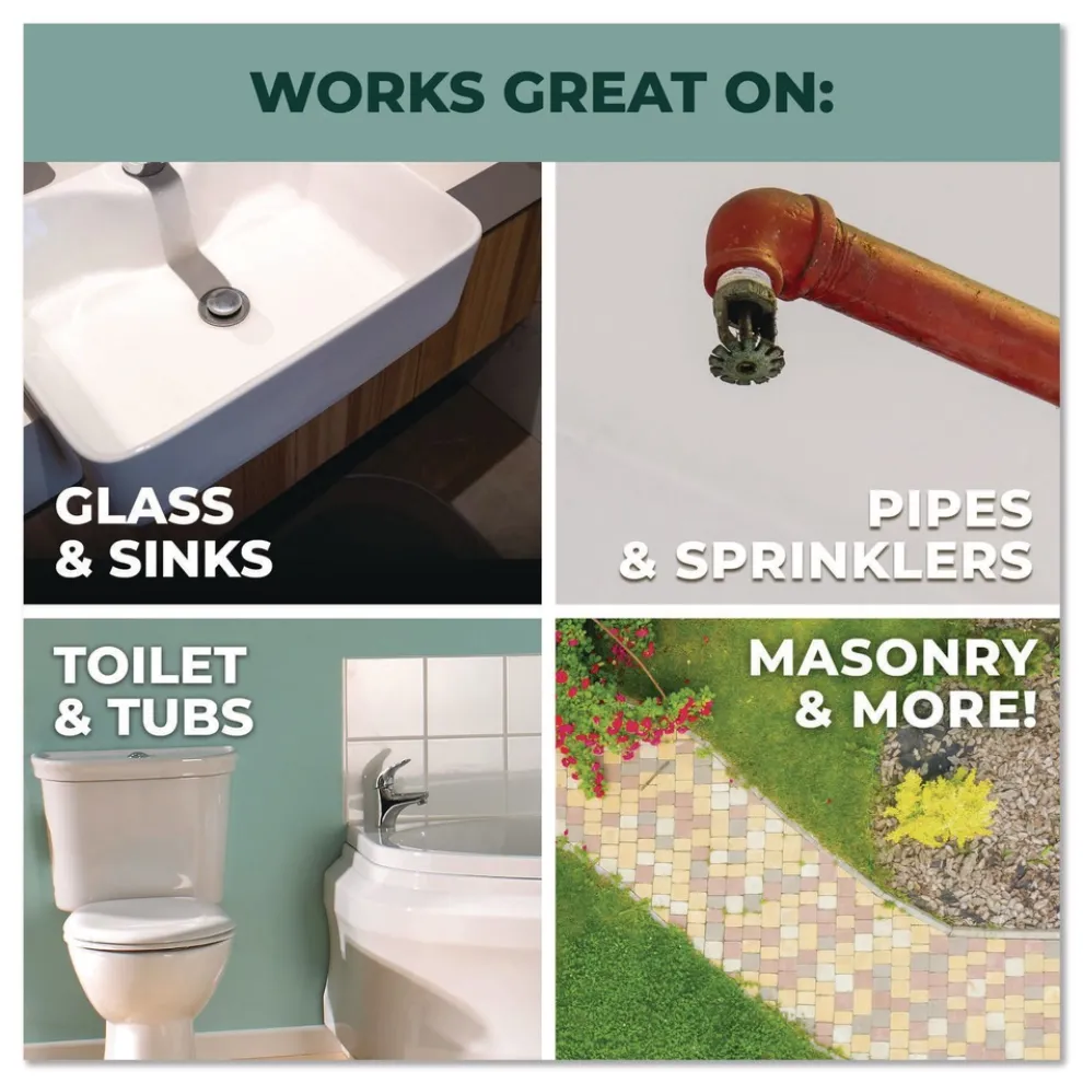 Removes hard water stains and restores clarity to landscaping equipment, outdoor lighting and other surfaces