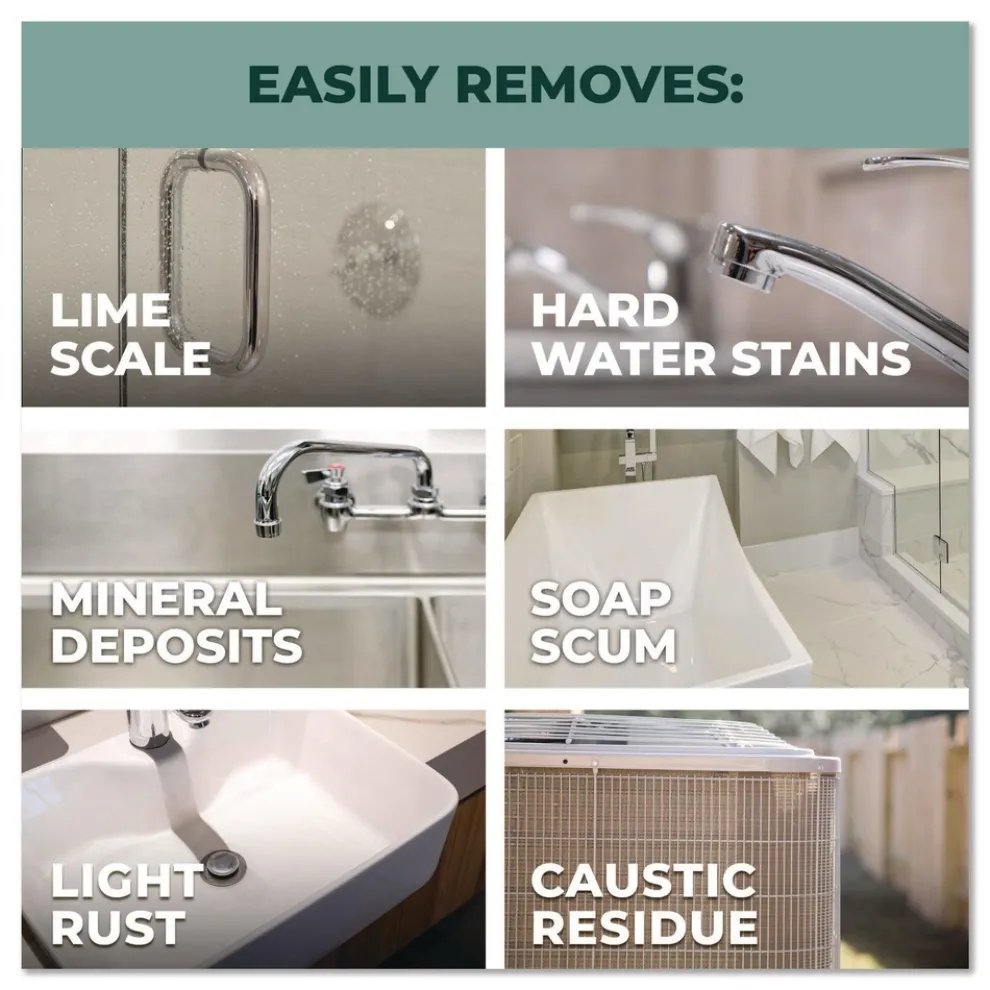 Powerful descaler removes even tough, built-up lime scale, mineral deposits, hard water stains, soap scum and oxidation with ease.