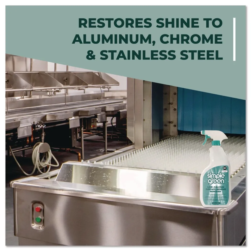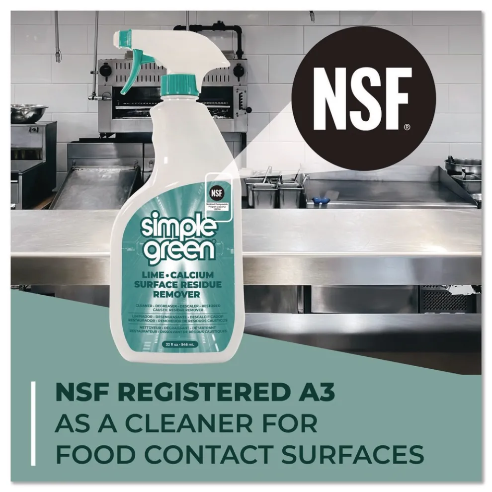 Simple Green Lime Calcium Surface Residue Remover is a powerful cleaner, degreaser, descaler, restorer, efflorescence and residue remover. NSF registered A3 as a cleaner for food contact surfaces making it ideal for use around food processing facilities and equipment. Easily removes lime scale, caustic and chlorinated cleaner residues, efflorescence, soap scum, mineral and organic deposits. Removes stains and restores clarity to stainless steel, chrome, aluminum, metals and other washable surfaces. Does not contain bleach, ammonia or phosphorus. Regular use prevents mineral deposit build-up to maintain plant asepsis.