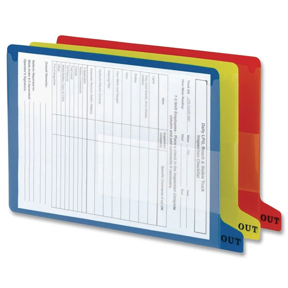 Clearly mark where a folder has been removed from the file by inserting an out guide in its place, putting an end to lost files. Preprinted charge-out forms on both sides indicate file taken, date taken and by whom. A red tab stands out from surrounding folders for quick location. Standard letter size aligns flush with end tab folders for closeable cabinets.