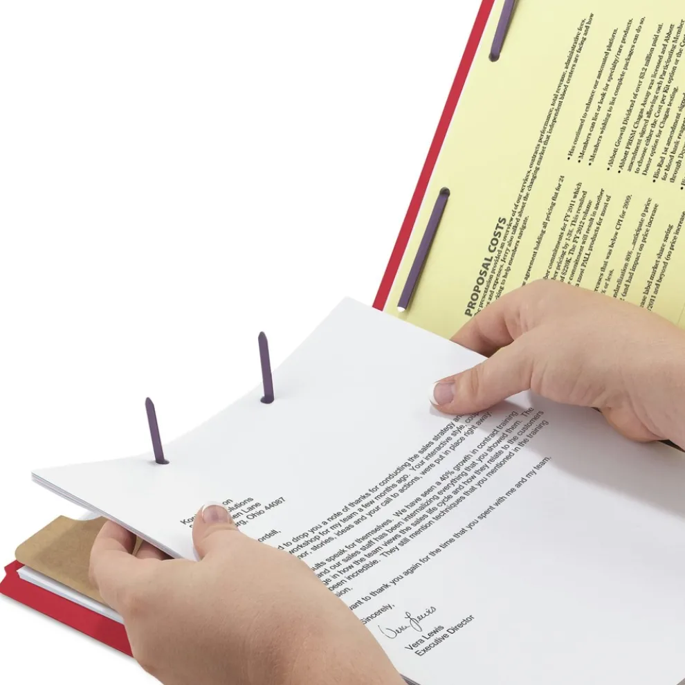 Partition folders with patented SafeSHIELD coated fasteners help prevent finger cuts, eliminate paper tears and reduce excessive fastener crinkling.