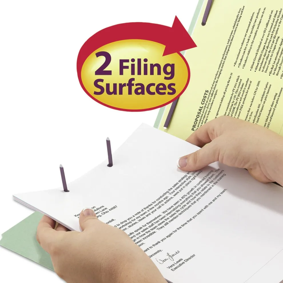 Sturdy, 25-point pressboard folders are great for large, bulky files that get plenty of use. Use them for project files, real estate transactions, loans, legal files and more. Tear-resistant, accordion-pleated gussets expand to accommodate growing paper trails. Two embedded fasteners keep documents secure and in the proper order. Each folder features 1/3-cut top tabs in assorted positions to ensure easy filing and retrieval.