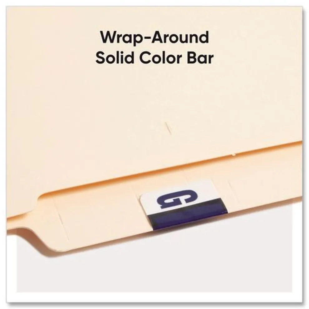 Keep files organized at a glance with these alphabetic labels that feature a wraparound solid color bar and a colored character printed on a white background. Colors are compatible with end tab systems using the bar-style format. Convenient dispensing box for easy peel off and application. Includes 500 labels per roll. Compatible with Tab Products 1283 series alphabetical labels.