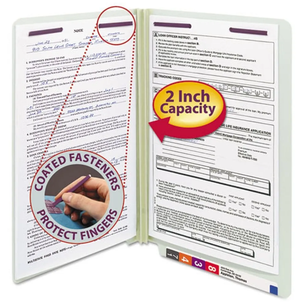 Made for large, bulky files that get plenty of use. Excellent for project files, real estate transactions, loans, legal files, or anytime you need to keep large amounts of paperwork in sequential order for frequent reference. SafeSHIELD Coated fasteners add protection for papers and fingers while also reducing fastener crinkling. Made of 25 point pressboard stock. Two 2 in. prong SafeSHIELD coated B style fasteners in positions number 1 and number 3.