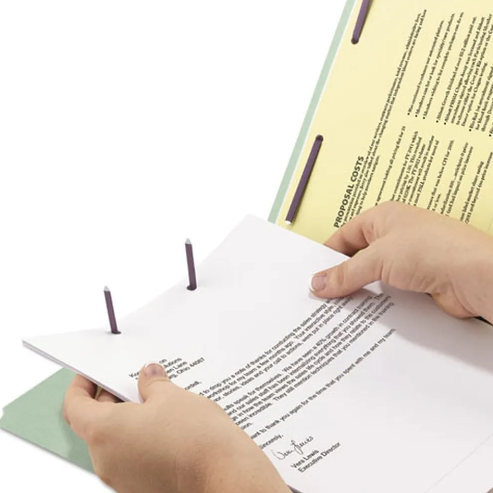 Made for large, bulky files that get plenty of use. Excellent for project files, real estate transactions, loans, legal files, or anytime you need to keep large amounts of paperwork in sequential order for frequent reference. SafeSHIELD Coated fasteners add protection for papers and fingers while also reducing fastener crinkling. Made of 25 point pressboard stock. Two 2 in. prong SafeSHIELD coated B style fasteners in positions number 1 and number 3.
