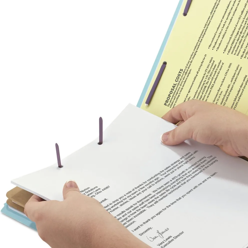 Partition folders with patented SafeSHIELD coated fasteners help prevent finger cuts, eliminate paper tears and reduce excessive fastener crinkling