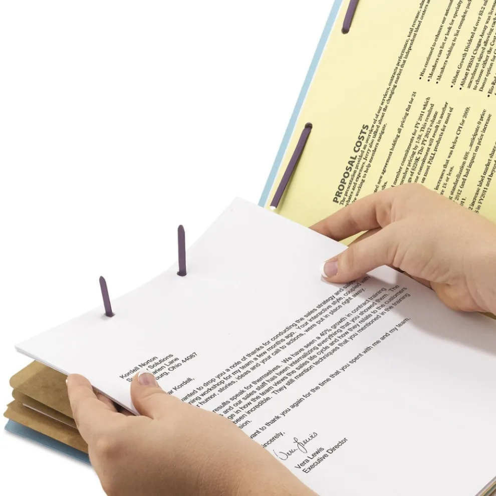Partition folders with patented SafeSHIELD coated fasteners help prevent finger cuts, eliminate paper tears and reduce excessive fastener crinkling
