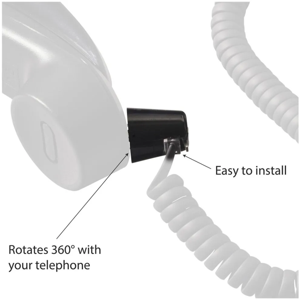 Ends twisted and tangled phone cords eliminating hassles. Automatically rotates with telephone for ease and convenience. Installs easily on handset without tools.