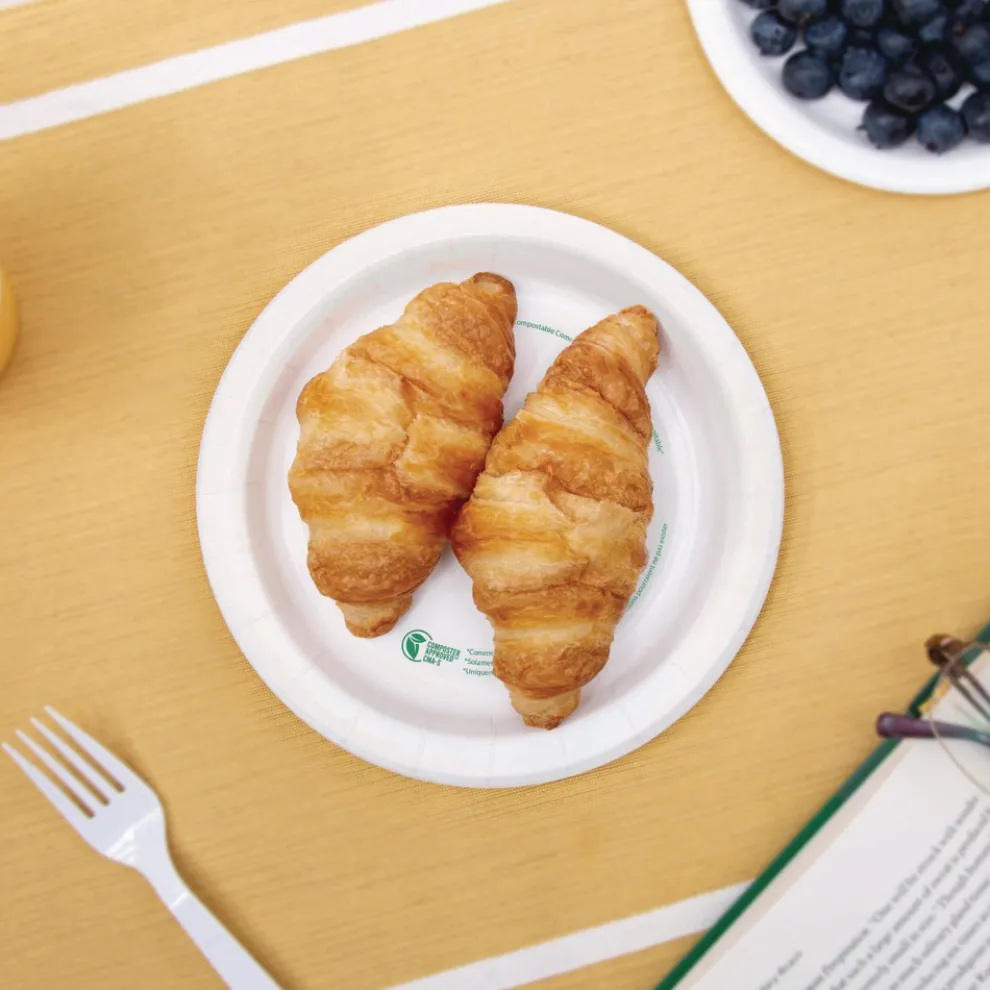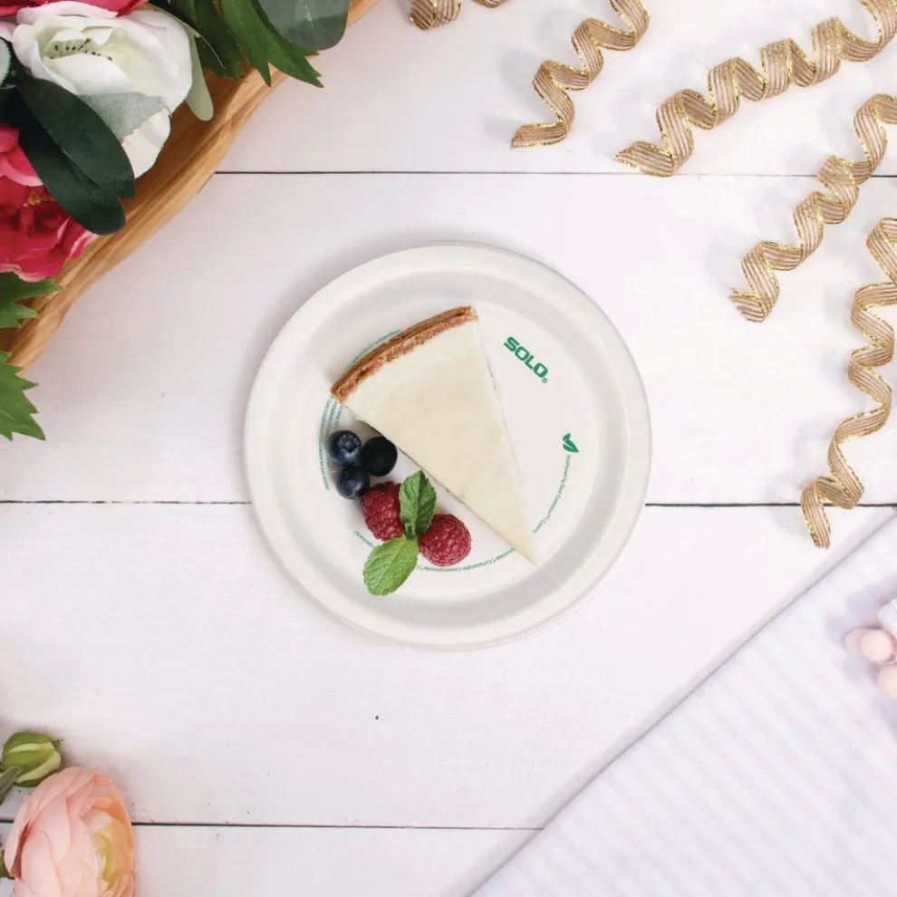 Serve smart with Solo Compostable Paper Dinnerware products. Stylish and durable, this dinnerware holds up against heavy and saucy foods. No unwanted messes thanks to the cut-resistant material. Make cleanup a breeze with the sturdy construction that won’t bend or fold. With moisture and grease resistance, nothing’s soaking through. Perfect for serving all your favorite foods at the office or catering event.