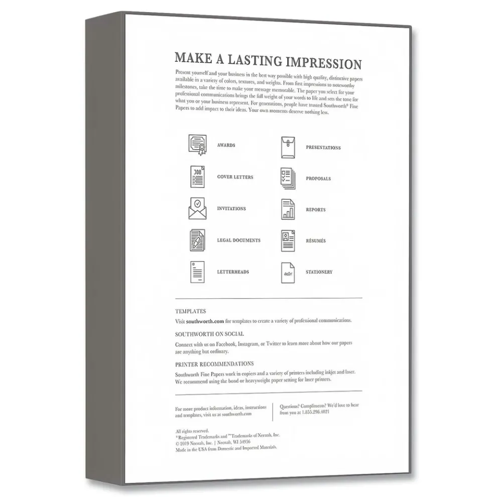High volume legal or professional service offices can rely on the consistency and longevity of this 25% cotton sheet. Its super-smooth surface brings cotton elegance to any document output on high-speed copier or laser printer. Moisture controlled to prevent curling. Acid- and lignin-free.