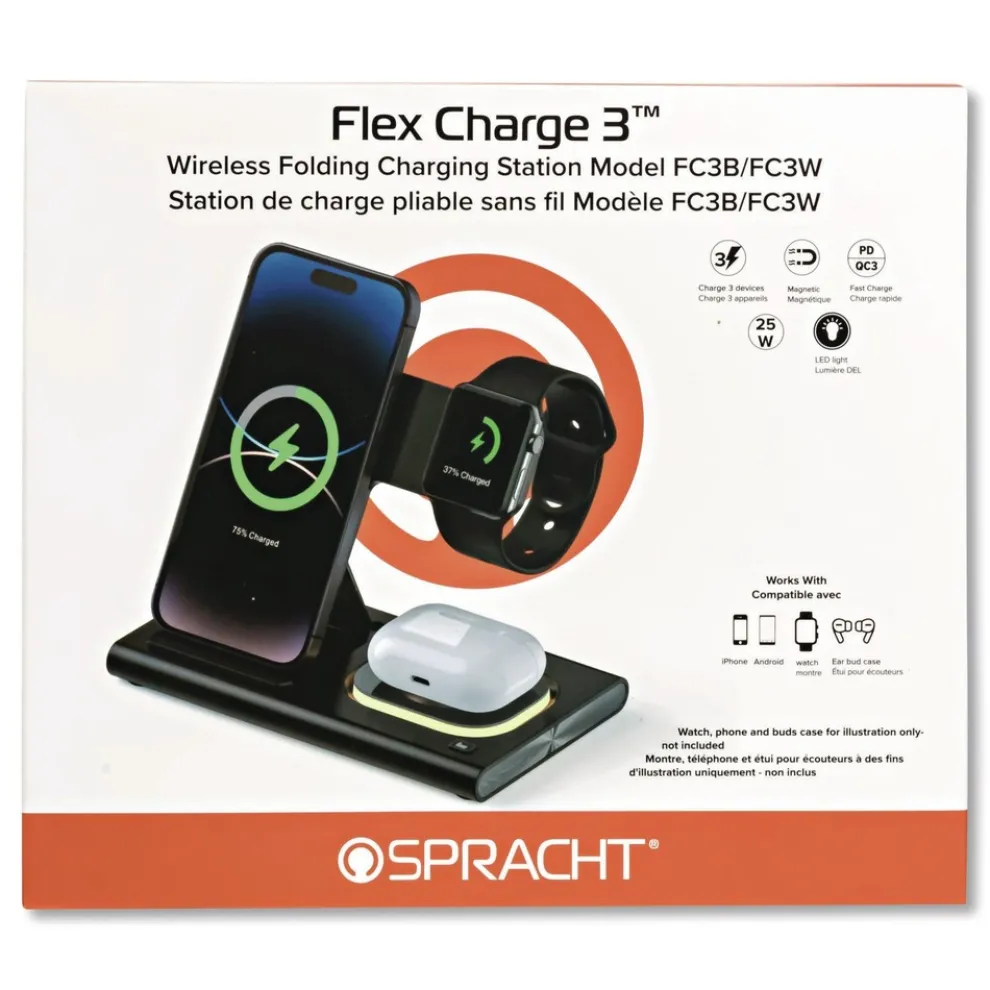 3-in-1 foldable wireless charging station that allows the station to be collapsed flat for easy storage or for travel; when collapsed it will easily fit in your travel backpack, laptop case or purse
