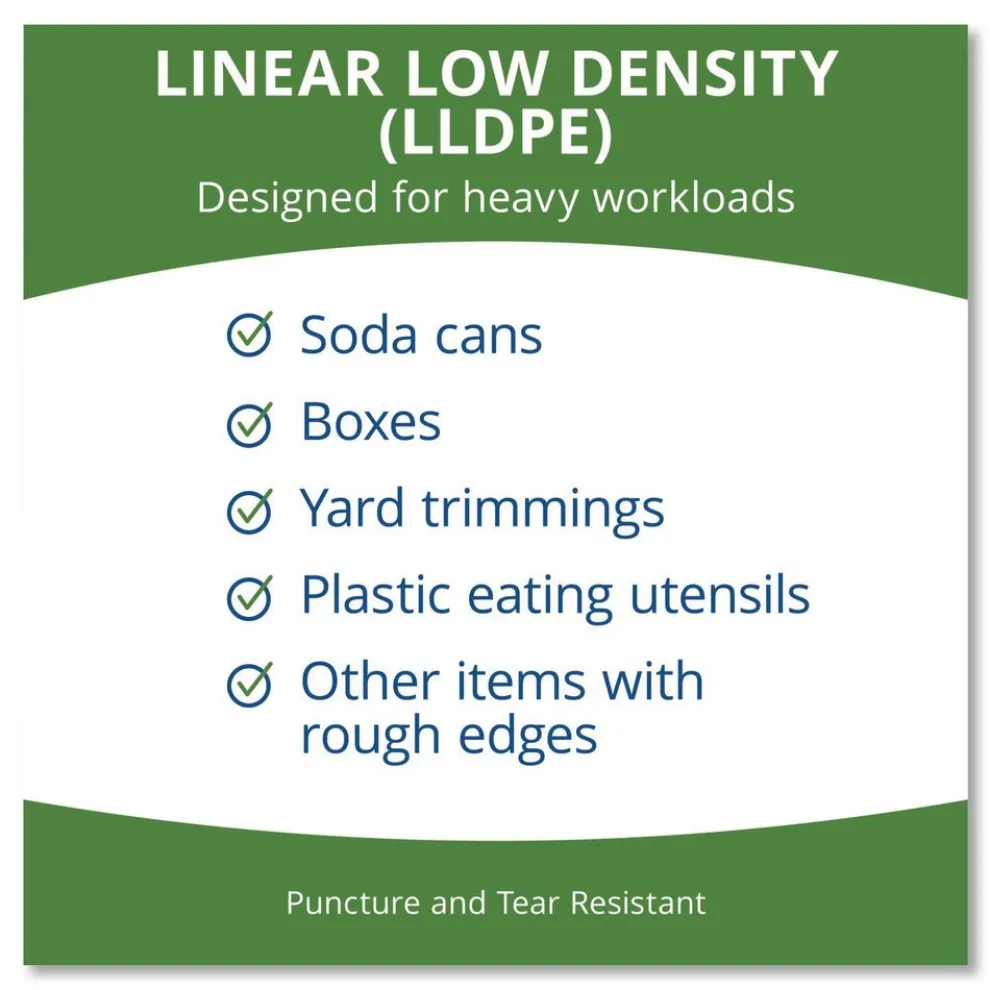Multiuse, strong, low-density recycled plastic bags provide maximum puncture and tear resistance. Lab tested for strength and reliability to recommended weight capacity. Designed for use in specified gallon-capacity containers. Perfect for home, office and industrial use.