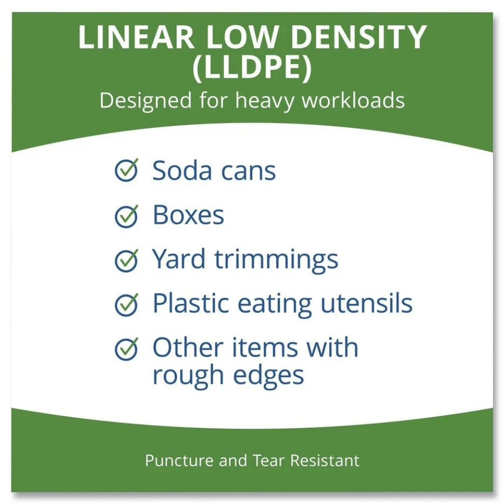 Multiuse, strong, low-density recycled plastic bags provide maximum puncture and tear resistance. Lab tested for strength and reliability to recommended weight capacity. Designed for use in specified gallon-capacity containers. Perfect for home, office and industrial use.