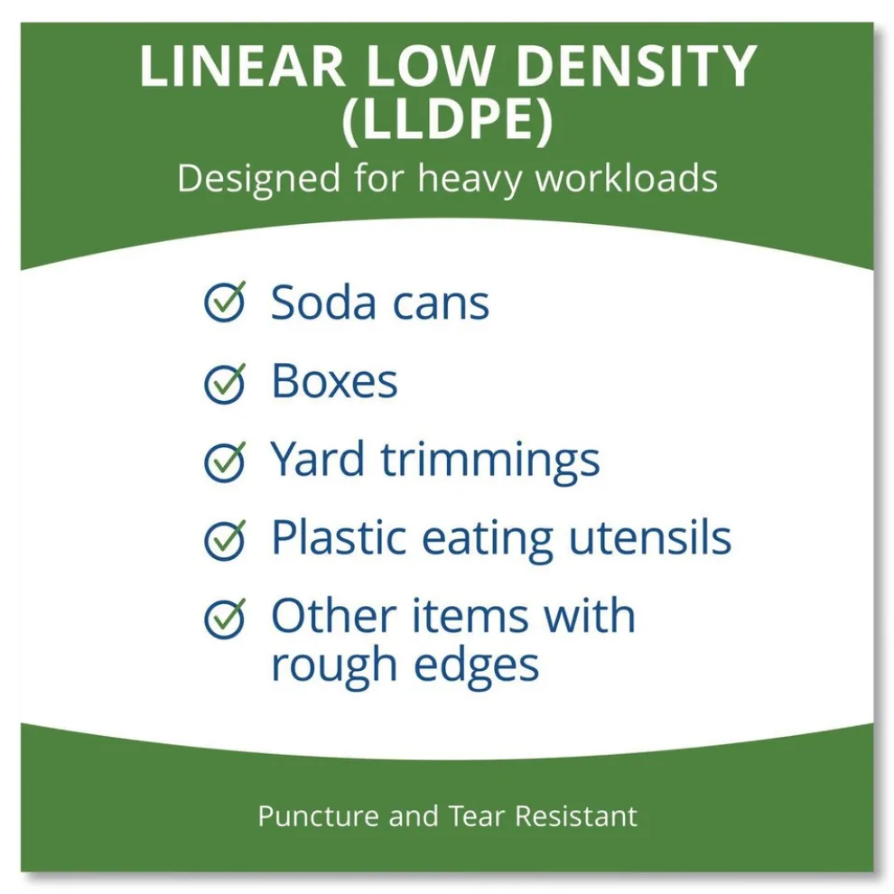 Multiuse, strong, low-density recycled plastic bags provide maximum puncture and tear resistance.