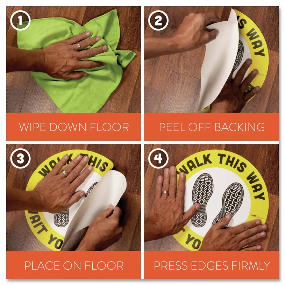 Promote social distancing in public places and businesses during COVID-19 with these floor decal stickers. They have the UL 410 Certification for Slip Resistance of Floor Surface Materials. Heavy 8.4 mil thick anti-slip textured vinyl holds up in high traffic areas. Easily repositionable on most surfaces. High performance removable acrylic pressure sensitive adhesive is engineered to provide clean, smooth removability from most surfaces, including glass, metal, painted surfaces, smooth concrete, and some plastics.