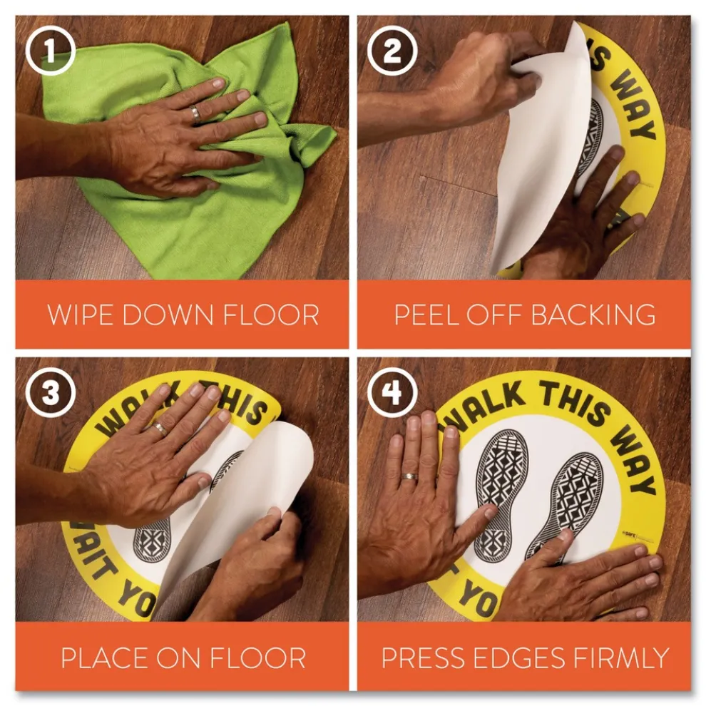 Promote social distancing in public places and businesses during COVID-19 with these floor decal stickers. They have the UL 410 Certification for Slip Resistance of Floor Surface Materials. Heavy 8.4 mil thick anti-slip textured vinyl holds up in high traffic areas. Easily repositionable on most surfaces. High performance removable acrylic pressure sensitive adhesive is engineered to provide clean, smooth removability from most surfaces, including glass, metal, painted surfaces, smooth concrete, and some plastics.