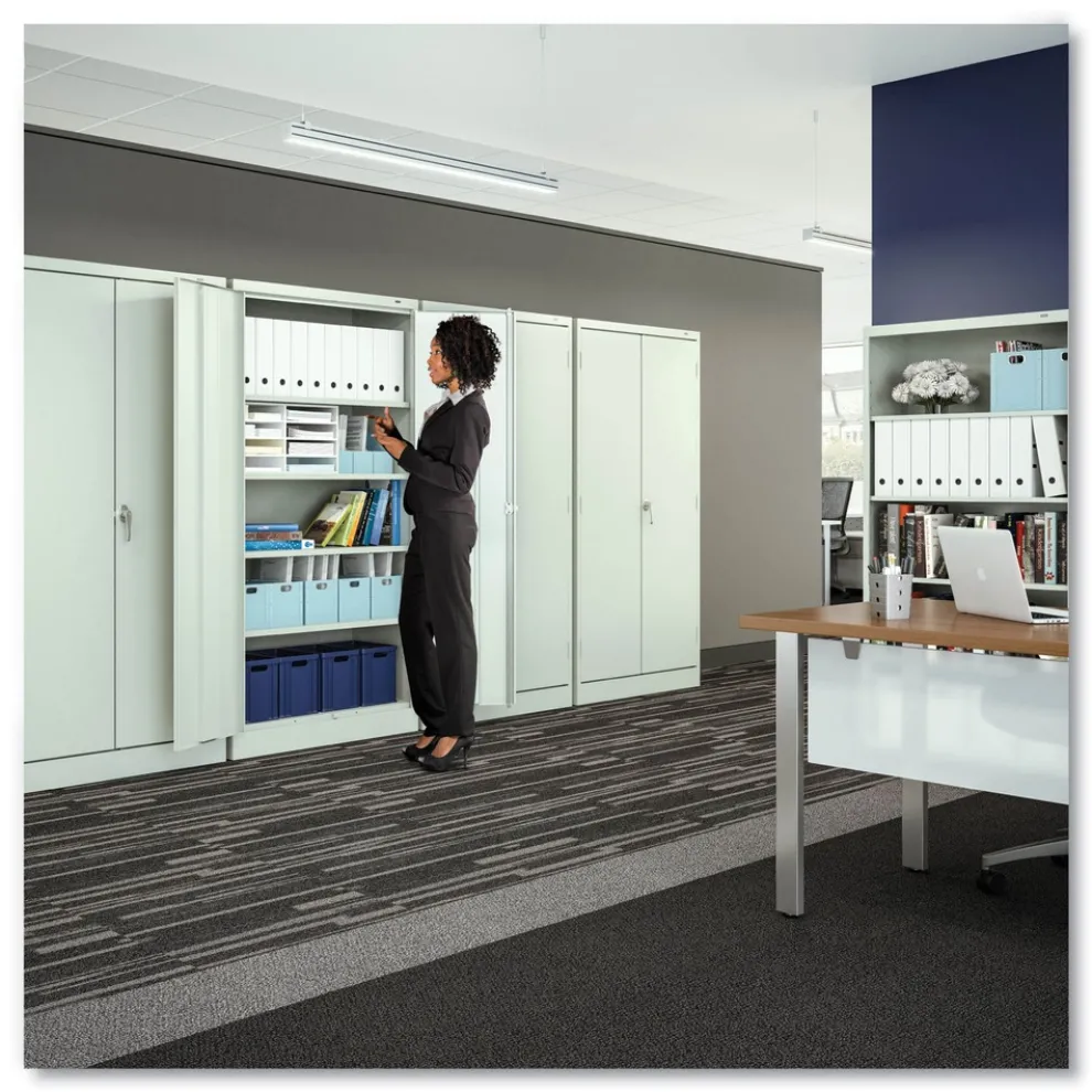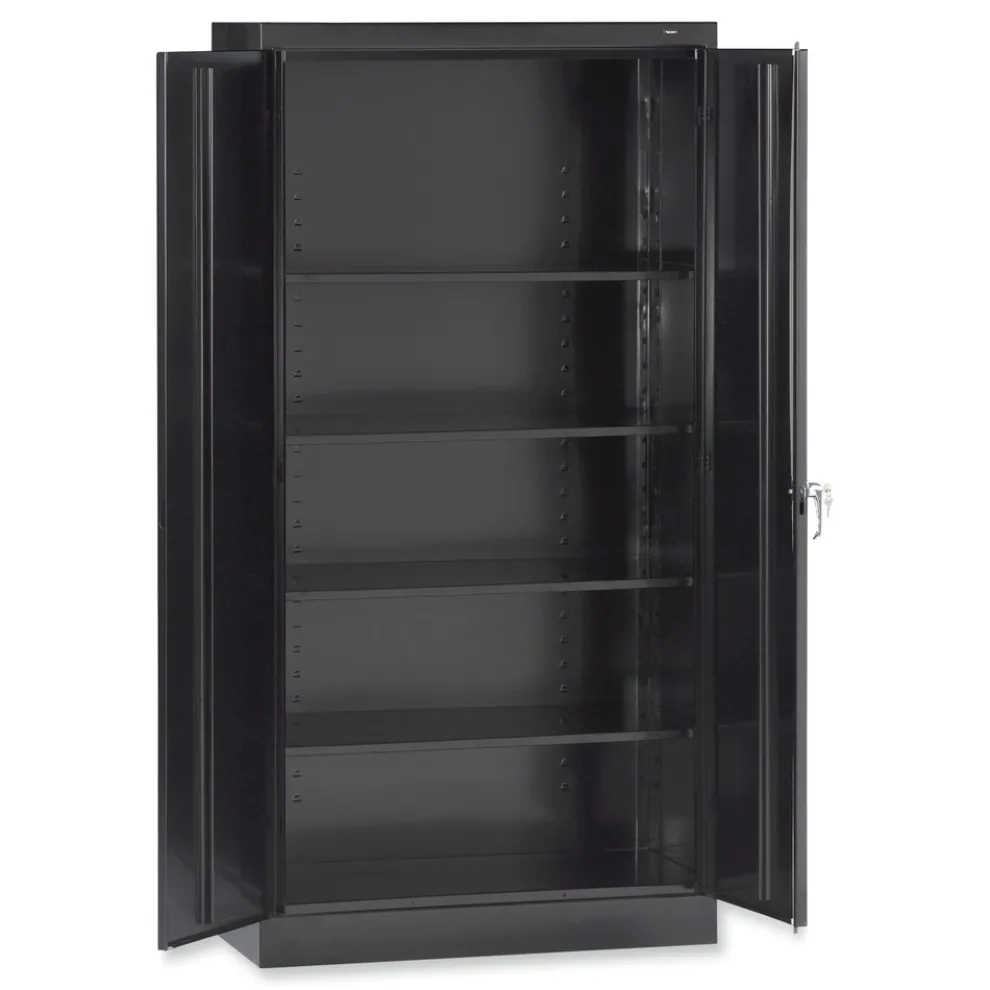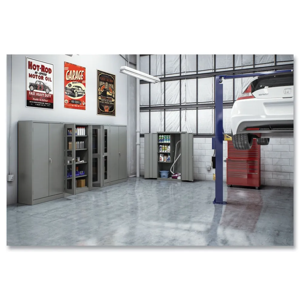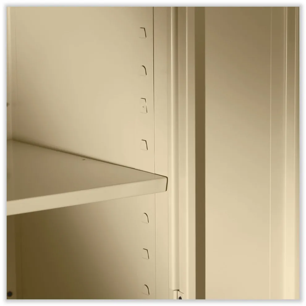 Commercial grade steel storage cabinet. Built with premium quality steel and reinforced doors for long-term performance at an attractive price. Polished chrome handle uses three-point keyed locking to lock both doors. Storage cabinet is electrostatically painted with a tough, long lasting powder finish to ensure years of lasting beauty.
