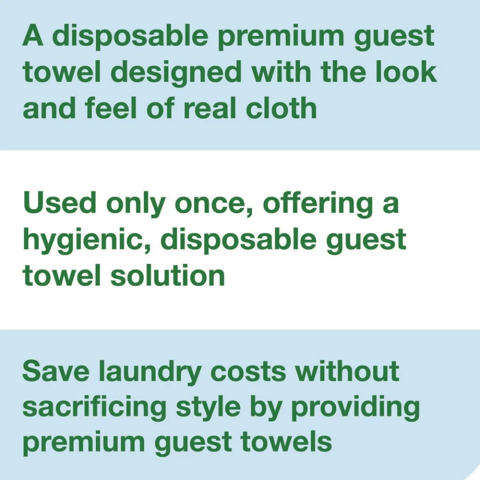 Impress guests with the exceptional quality and elegance of our cloth-like disposable guest hand towels, designed with the look and feel of real cloth. Each towel is noticeably softer and bulkier than standard guest towels, providing the ultimate in absorbency, hand feel, and overall quality. Best of all, there are no hidden costs such as linen service fees, replacement fees, or laundering costs. Each hand towel is used only once, ensuring a hygienic experience for guests. This product contains 100 percent virgin fibers and comes poly-wrapped to protect the guest towels.