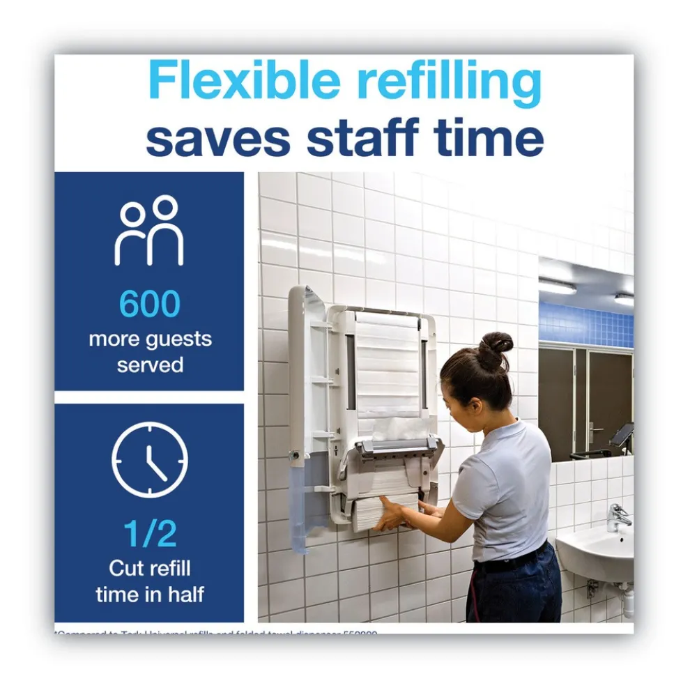 Tork® PeakServe® Continuousâ„¢ Hand Towels means fewer washroom delays—gets guests in and out faster. Avoid run outs with 250% more hand towels and lower consumption thanks to one-at-a-time dispensing. Faster dispensing serves guests in three seconds—quicker than jet air drying time. Taking a towel is always smooth and easy with our patented continuous towel system. More flexibility means more time to clean. Top it up when it suits you with up to 600 more guests served between refills. Double the towels you carry as they’re compressed by 50%. Cut refill time in half with over 2,000 towels per dispenser. Poly bag wrapped.