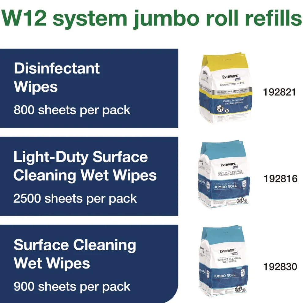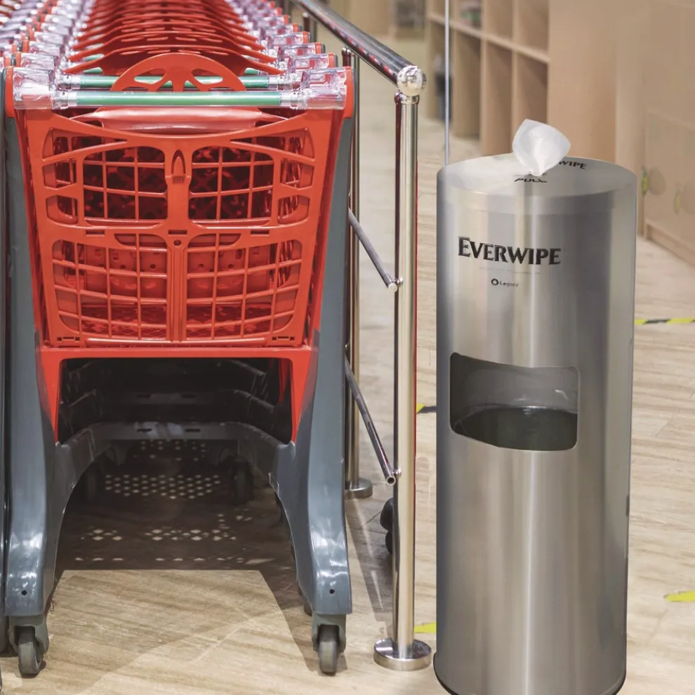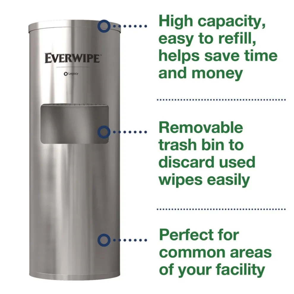 The stainless steel dispenser stand keeps you ready for business, providing your customers with easy access to wet wipes. This jumbo roll dispenser allows for high volume usage, and needs refilling less often, saving you time and money. The sleek and modern stainless steel finish blends in with any commercial decor for a clean-looking environment. This standalone wipe dispenser includes a trash bin to discard used wipes. Compatible with Everwipe by Tork W12 refills.