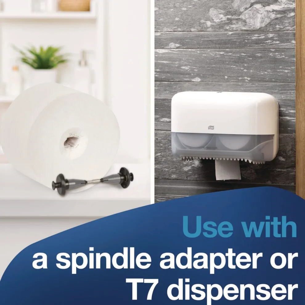 Tork Coreless is a high-capacity coreless toilet paper system for facilities where efficiency, sustainability, and providing a great experience are key. High capacity, reduced storage space, and certified easy-to-use dispensers make it a better alternative to conventional bath tissue and jumbo rolls. These 2-ply tubeless toilet paper rolls fit a wide range of compatible coreless toilet paper dispensers to meet different restroom needs, so the same compact toilet paper refills can be used across the facility. Compared to conventional bath tissue, Tork coreless rolls hold two times more paper, with no core and no wrap for less waste.