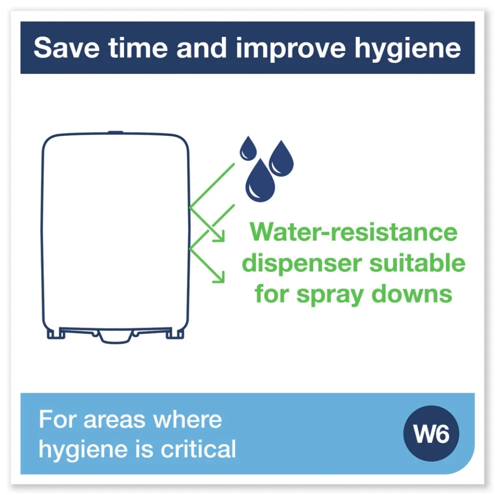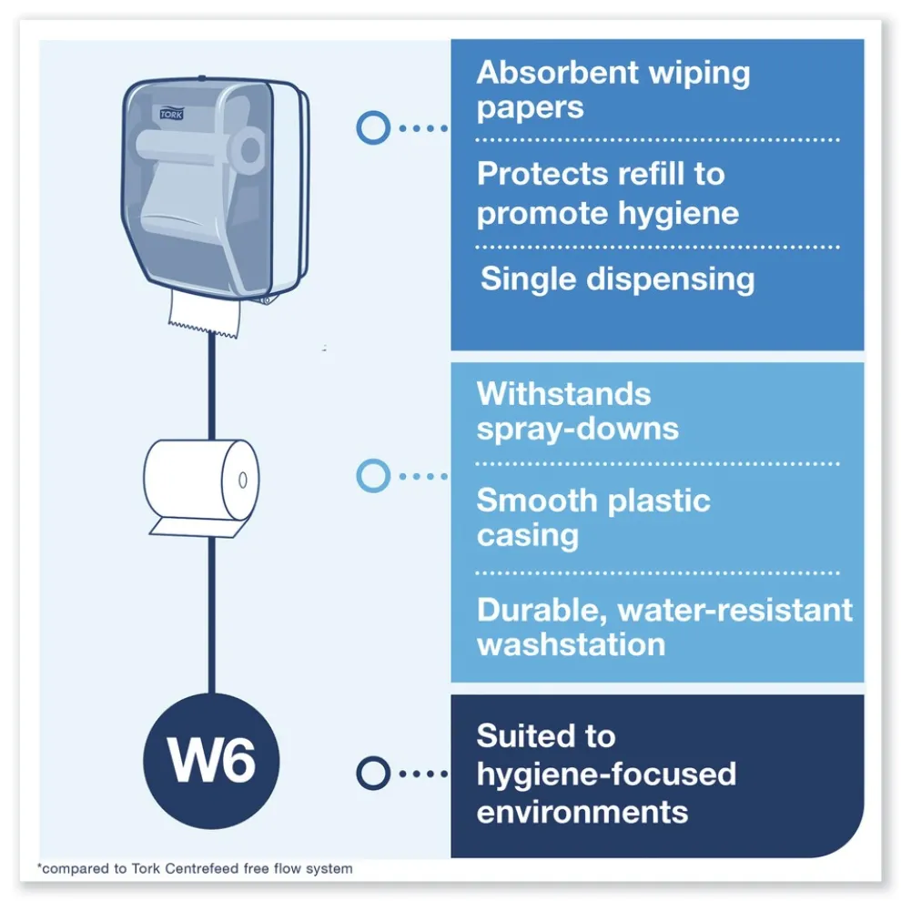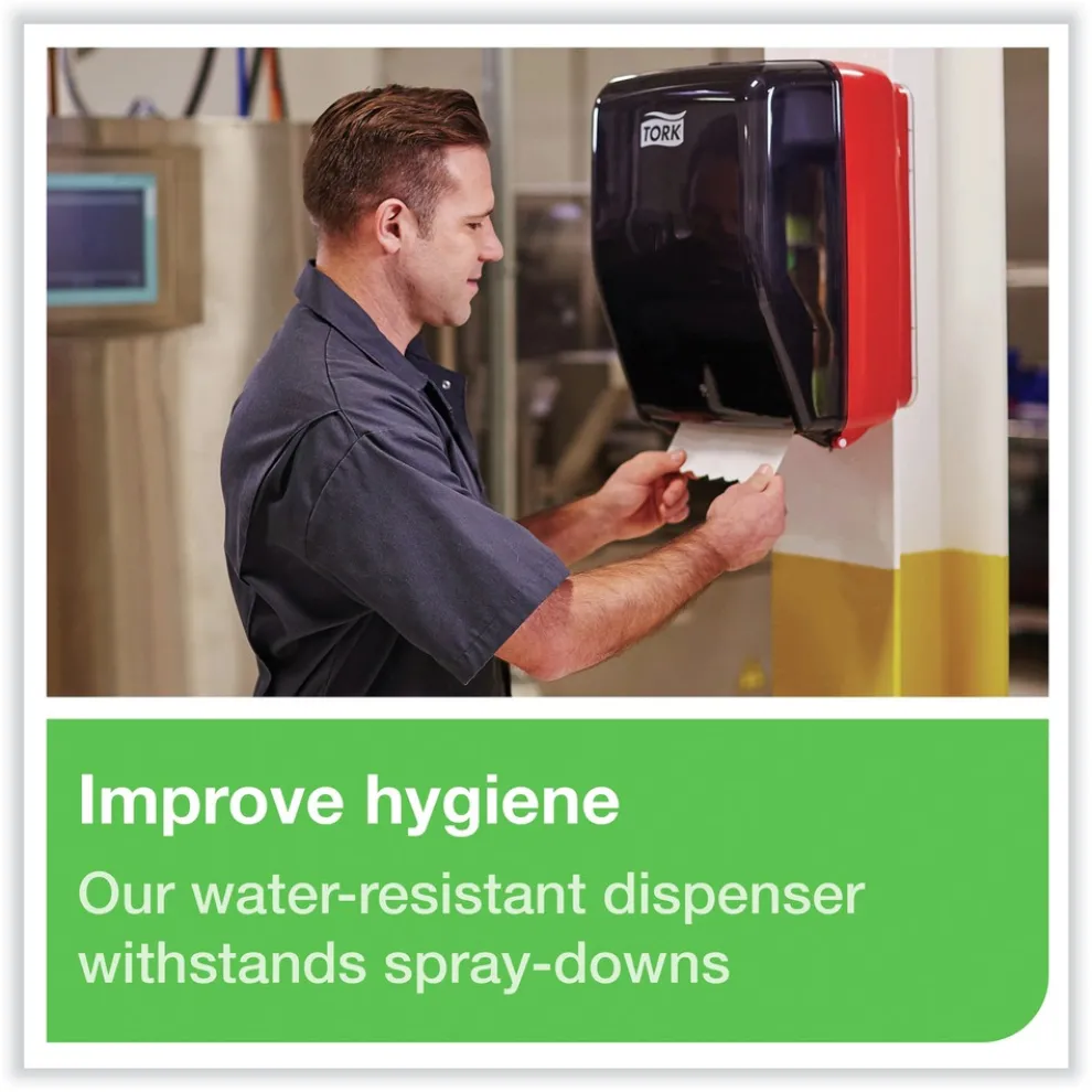 The Tork® Washstation Dispenser in Performanceâ„¢ Design is a one-at-a-time paper wiper dispenser that offers a high level water resistance and accommodates a large capacity refill. Designed from the ground up, this dispenser fits seamlessly into your cleaning or HACCP protocols. It’s built to withstand wet environments and does not require removal during spray-downs, keeping refills safe and hygienic for every use. And with a smooth, durable, plastic casing, it’s easier to maintain and keep clean. Save on cost, labor and waste with a water-tight dispenser that protects refills from spray-downs or in wet areas, all while delivering a stylish impression.