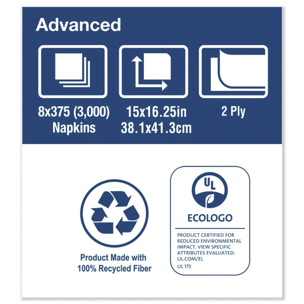 Tork® Advanced Dinner Napkins offer embossed facial quality that brings class and practicality to casual dining. Bag packaging ensures that the napkins are always fresh and sanitary. Embossed facial quality that brings class and practicality to casual dining. Made from recycled materials to offer a positive image builder.