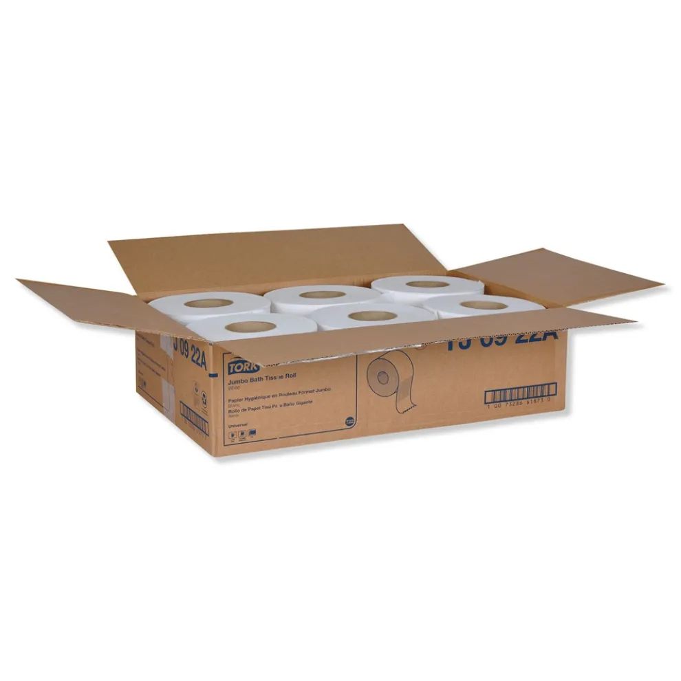 Tork® Universal Jumbo Bath Tissue delivers quality, value and performance. Made with no added dyes or fragrances. Rapid break-up capability is ideal for all plumbing systems. Universal core is designed to fit virtually all size jumbo tissue dispensers. Extra long lasting tissue means fewer changes, less maintenance and better control of paper waste. Designed to maximize performance and convenience while minimizing your overall costs. Smaller case cubes frees up about 4% more storage space vs. conventional rolls.