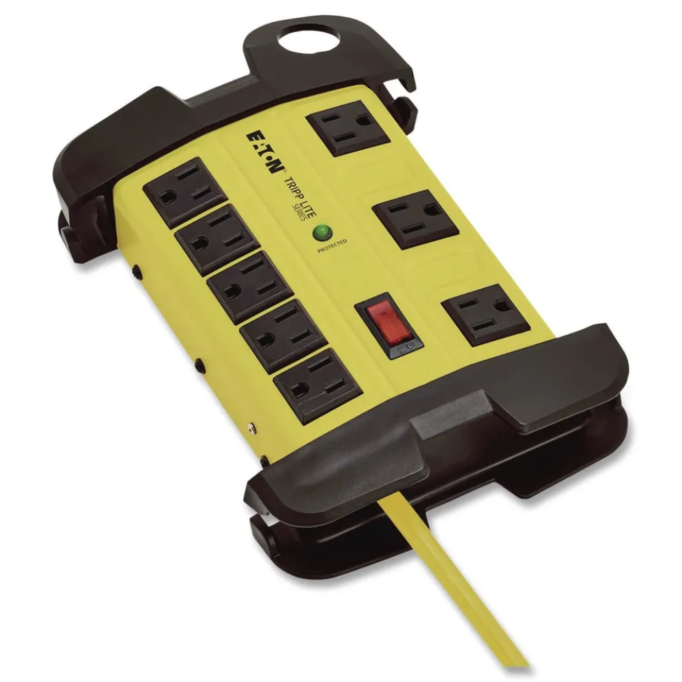Designed to provide safe, reliable surge protection in harsh environments. 8 outlets protect connected equipment against damaging surges, spikes and line noise. Wide-spaced outlets accommodate multiple transformer plugs without blocking other outlets. Green LED confirms that connected equipment is being protected. Rugged case stands up to the harshest environments. A lighted on/off switch with integrated circuit breaker provides power control over connected equipment. Breaker protects against dangerous system overload. Protected LED confirms that connected equipment is being protected. A rugged metal case stands up to the harshest environments. Built-in cord wrap with hang holes provides convenient cord management. As an added safety feature, the surge suppressor’s bright yellow color alerts you and others that power cords and tools are in use.