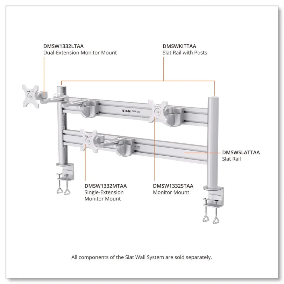 This 40″ slat rail allows mounting of multiple displays simultaneously. It adds another slat rail and easily installs to your existing Slat Rail with Posts (DMSWKITTAA), sold separately, so you can install more monitors in your workspace. Monitors are elevated above the desktop, which frees up precious workspace. You can also slide the monitors along grooves and then adjust the viewing angle for optimal ergonomics. Grooves on both sides of the slat rail accommodate independently adjustable monitor setups when desks are pushed together back-to-back. In addition, this slat wall system also has options for three VESA-compliant monitor mounts (DMSW1332STAA, DMSW1332MTAA and DMSW1332LTAA), all sold separately. Compliant with the Federal Trade Agreements Act (TAA), which makes it eligible for GSA (General Services Administration) Schedule and other federal procurement contracts.