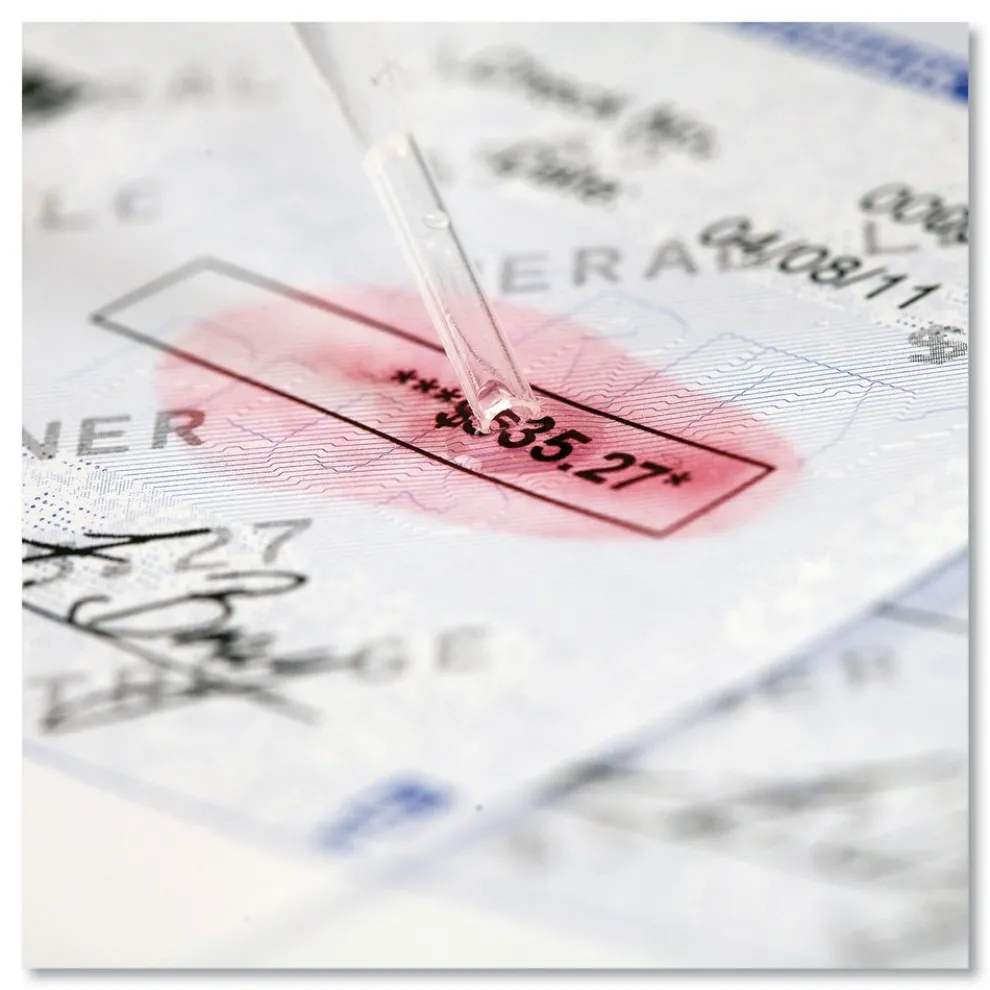 Formulated according to world-wide banking standards. Prevent check tampering and alteration with high-quality MICR Toner Secure. Contains a hidden red security agent. If chemical alteration is attempted a red stain will appear.