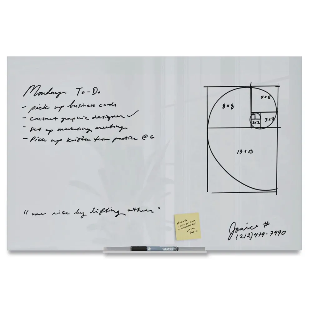Premium tempered glass dry erase surface never stains or ghosts.
