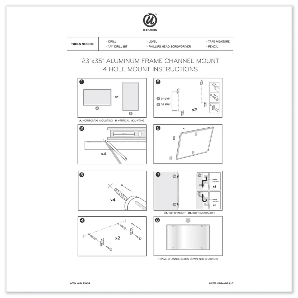 Silver aluminum PINIT frame magnetic dry erase calendar board is a perfect and functional solution for the frequent usage areas of your office, school classroom, home or any commercial space. Although all dry erase markers work well with this board, the U Brands dry erase markers provide the ultimate writing and eras-ability experience. Magnetic painted steel writing surface will require minimal ongoing cleaning care to ensure the best performance and resist ink staining and ghosting. Monthly view enables you to keep track of your hectic schedule. Simply use any dry erase board spray or wet dry erase board wipes after continuous use to clean the writing surface. Magnetic writing surface functions as a bulletin board as well; simply use any board magnets to pin all of your notes, messages, pictures, memos, calendars, menus, reminders and more. You may also attach all U Brands magnetic board markers and accessories (sold separately) to the board surface without using the marker tray. Strong and thick insulation underneath the dry erase surface, combined with the aluminum frame provides a firm and rigid construction. Whiteboard has a universal mounting system, as it can be hung horizontally.